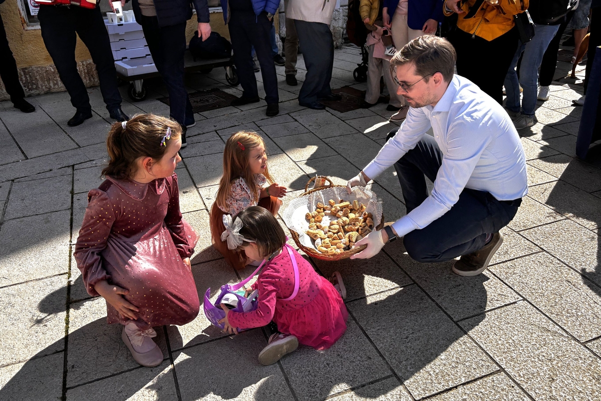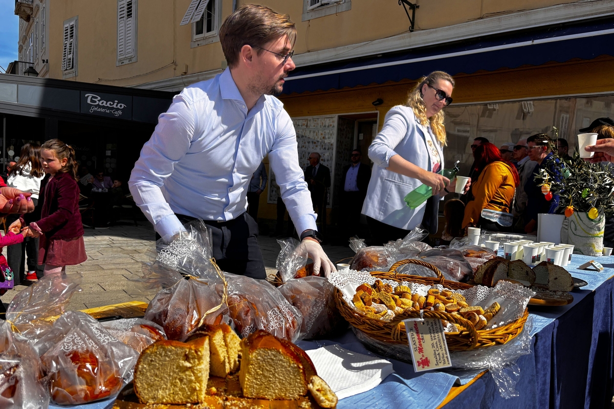 Nakon mise na Uskrsni ponedjeljak, kada se u kršćanskoj tradiciji spominje Isusov susret s učenicima na putu u Emaus sa snažnom porukom zajedništva i nove nade, gradonačelnik Marin Gregorović i direktorica Turističke zajednice Grada Cresa Željka Stašić sa suradnicama počastili su sugrađane i mnogobrojne turiste tradicionalnim uskrsnim krušnim proizvodima, pincama i šiširecima, uz čašu osvježavajućeg napitka.