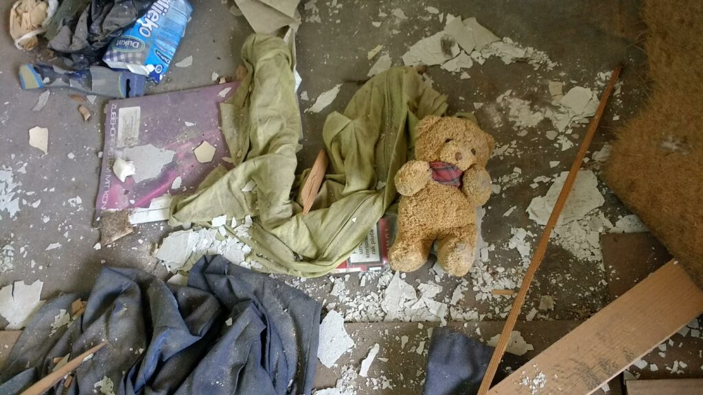 Ono što posebno uznemiruje u Đekićevim svjedočanstvima su tragovi boravka ljudi na samom rubu egzistencije, beskućnika i ilegalnih stanara čiji su stari madraci, prljava odjeća i ostaci hrane razasuti po kutovima soba koje su nekad nudile nadu u novi početak. Đekić je tada primijetio i hrpe potpuno nove odjeće s etiketama, što je dalo naslutiti da zgrada možda služi i kao ilegalno skladište za ukradenu robu, dok u mračne podrumske dijelove zbog realne opasnosti od urušavanja ili napada nije ni želio ulaziti.
