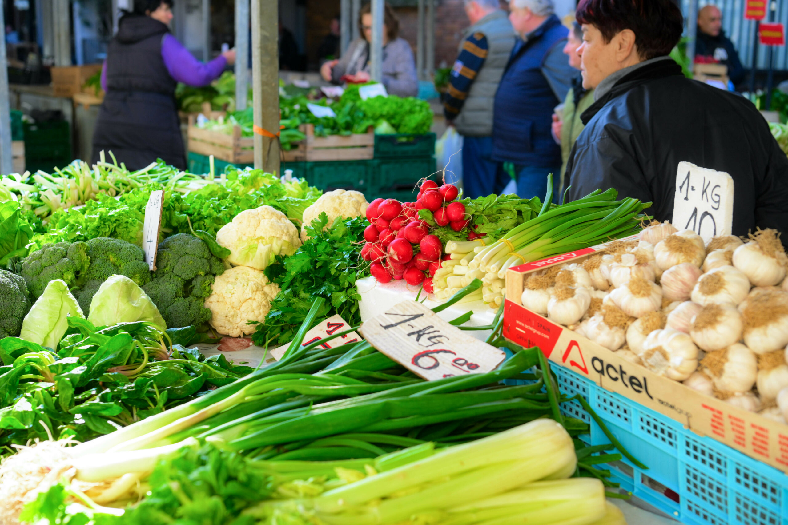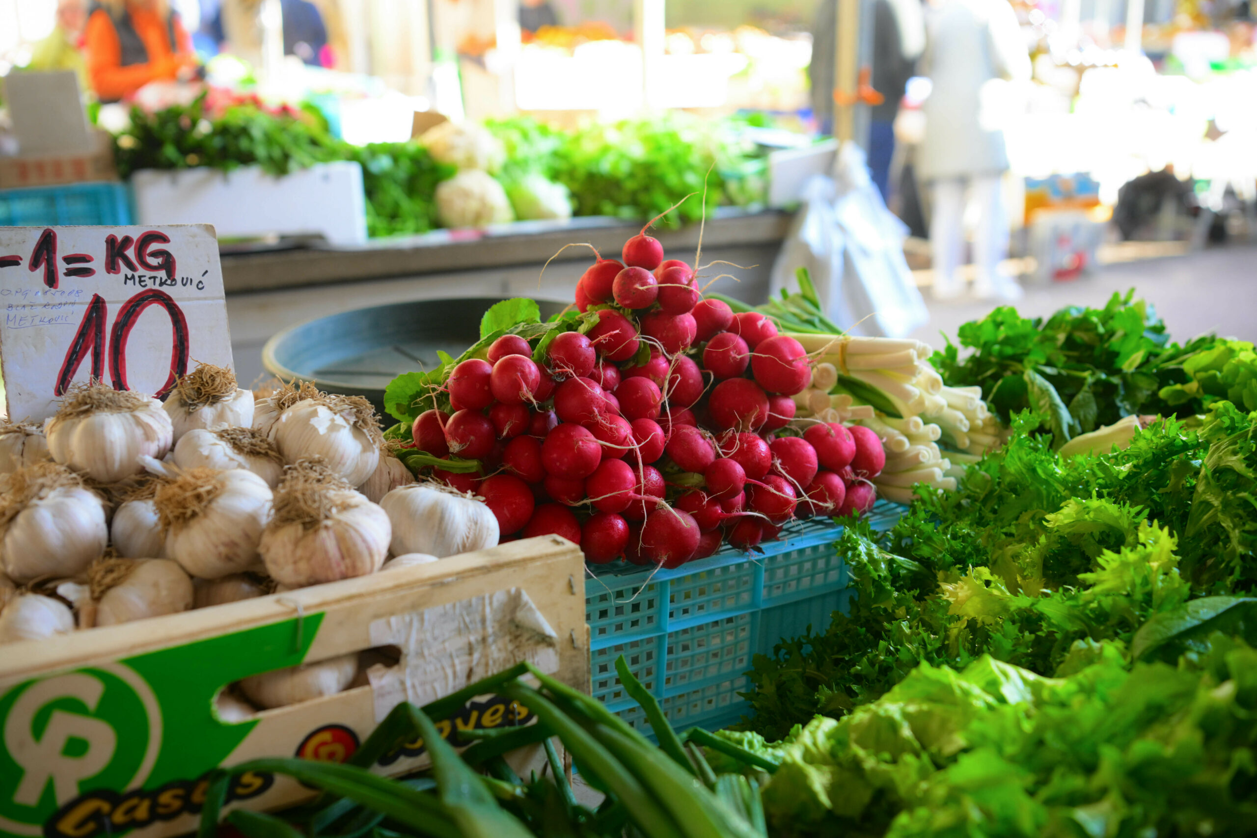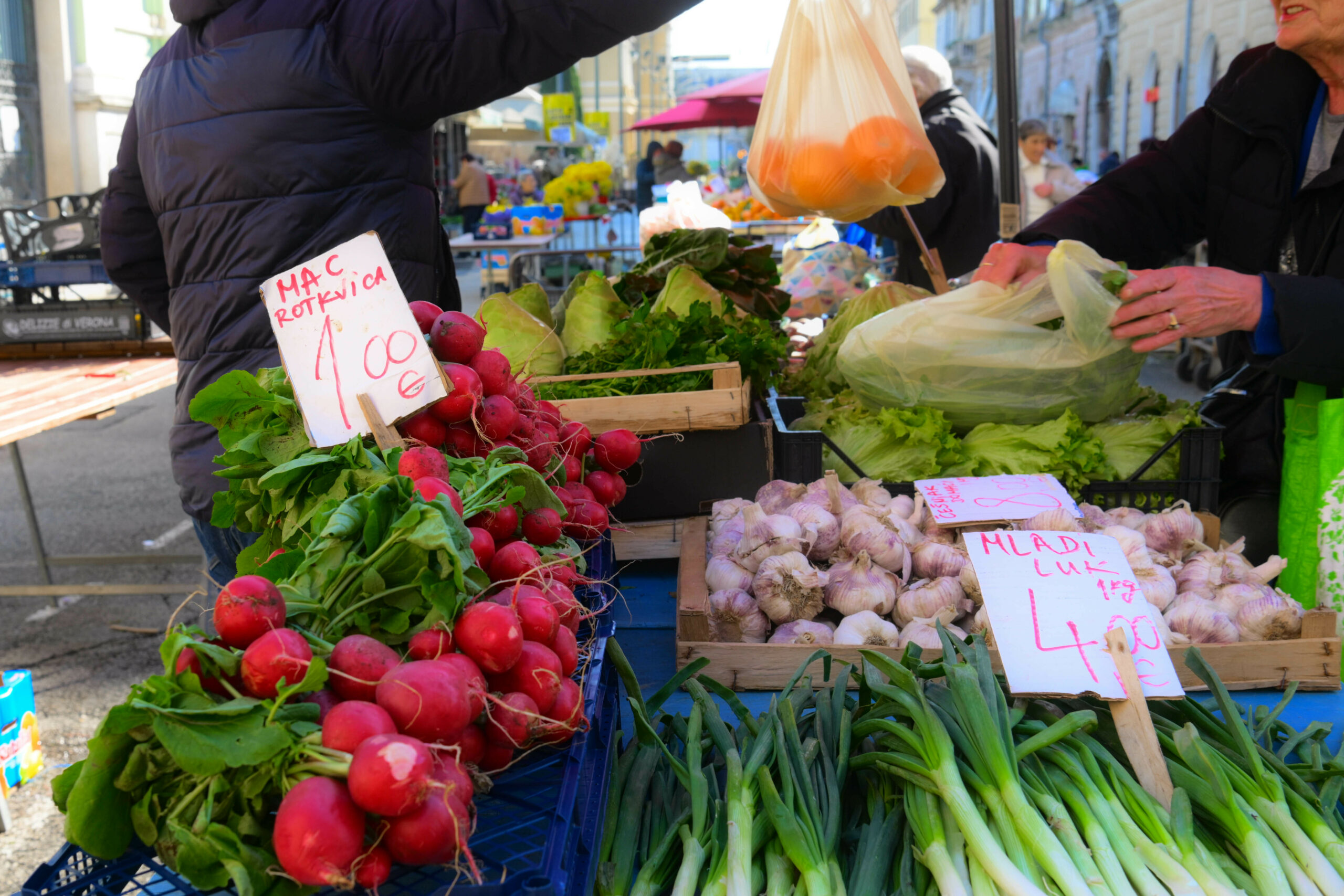 Osim cvjetnog asortimana, tržnica ovih dana nudi i bogat izbor svježeg povrća koje je neizostavan dio proljetnog jelovnika. Kilogram mladog kupusa i mrkve trenutno se prodaje po cijeni od 2 eura, dok je za blitvu i poriluk potrebno izdvojiti 3 eura po kilogramu. Ponuda na brojnim štandovima uključuje i tradicionalne vezice domaćih proizvoda, pa tako mac raštike iznosi 2 eura, dok se svježi mac kapulice može kupiti za svega 1 euro, koliko koštaju i rotkvice. Stigle su i šparoge po 5 eura za jedan mac.