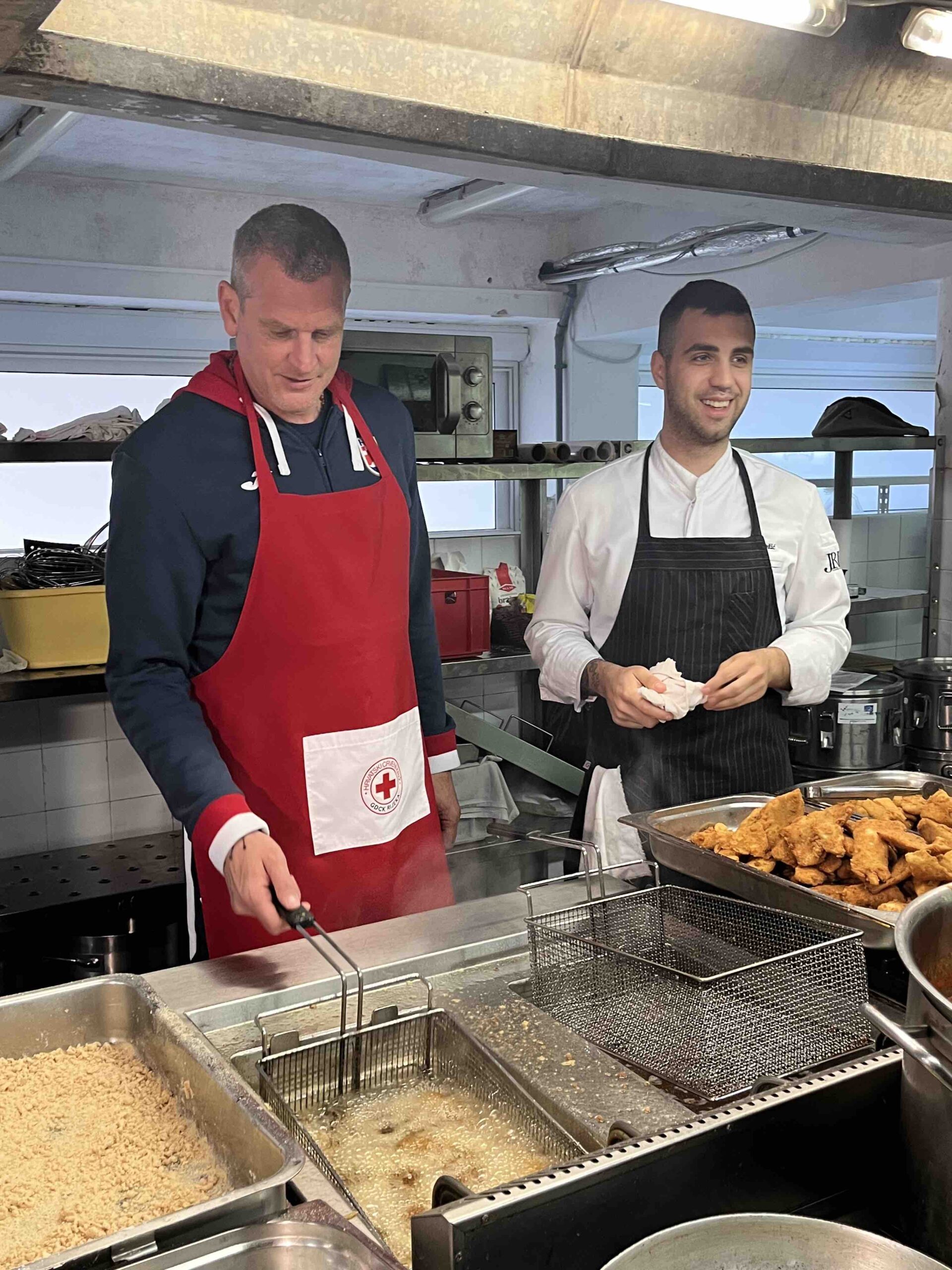 U Domu Crvenog križa na Pećinama, zajedno sa zaposlenicima ugostiteljskih djelatnosti Crvenog križa Rijeka, u pripremi obroka sudjelovali su izbornik hrvatske rukometne reprezentacije Goran Perkovac, vratar reprezentacije Marin Šego, trener vratara Valter Matošević, voditelj Ureda za odnose s javnosti HRS-a Drago Ćosić, dugogodišnji rukometni djelatnik MRK Zamet Marin Mišković, predsjednik Županijskog rukometnog saveza Boris Konjuh te rukometni trener Drago Žiljak.