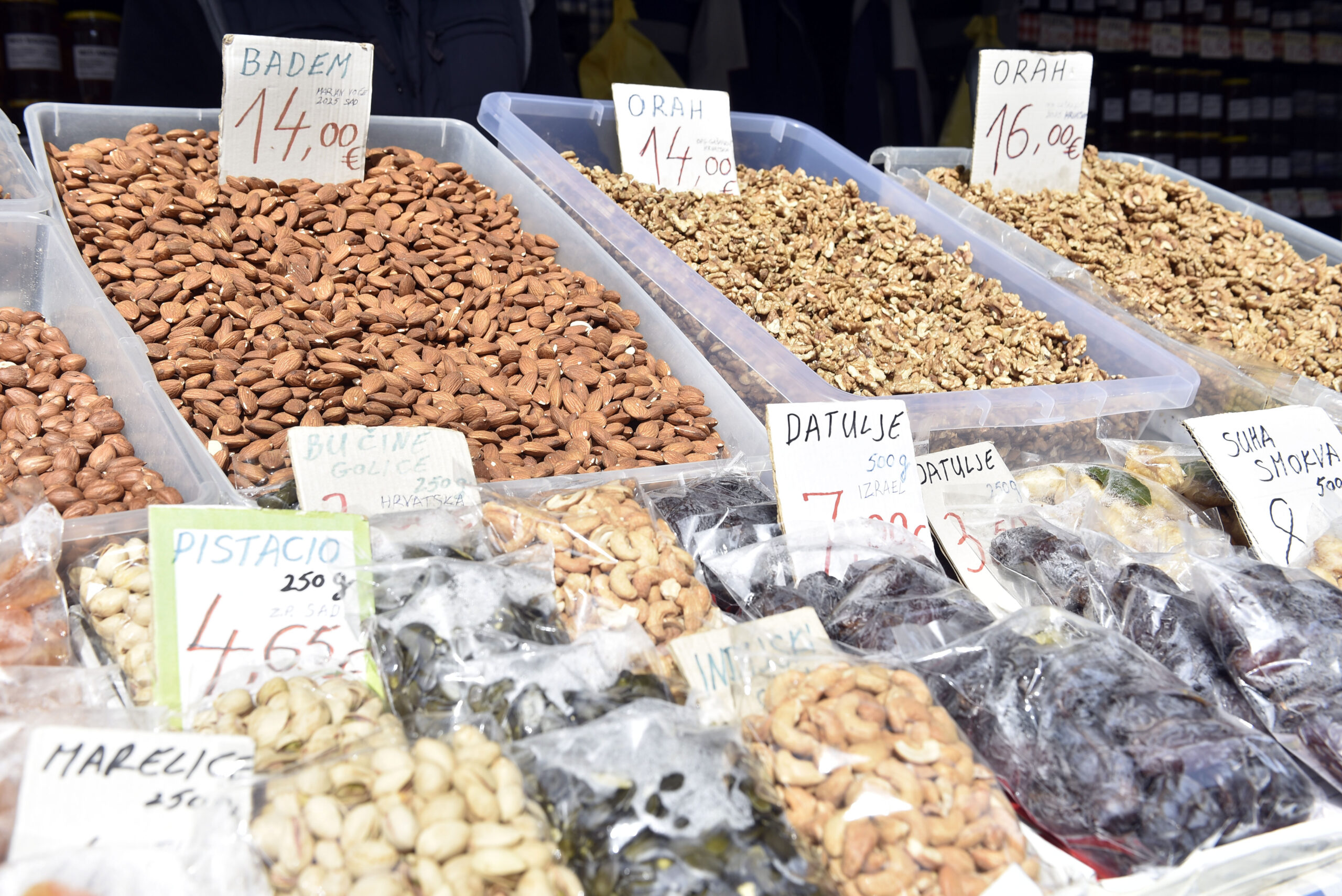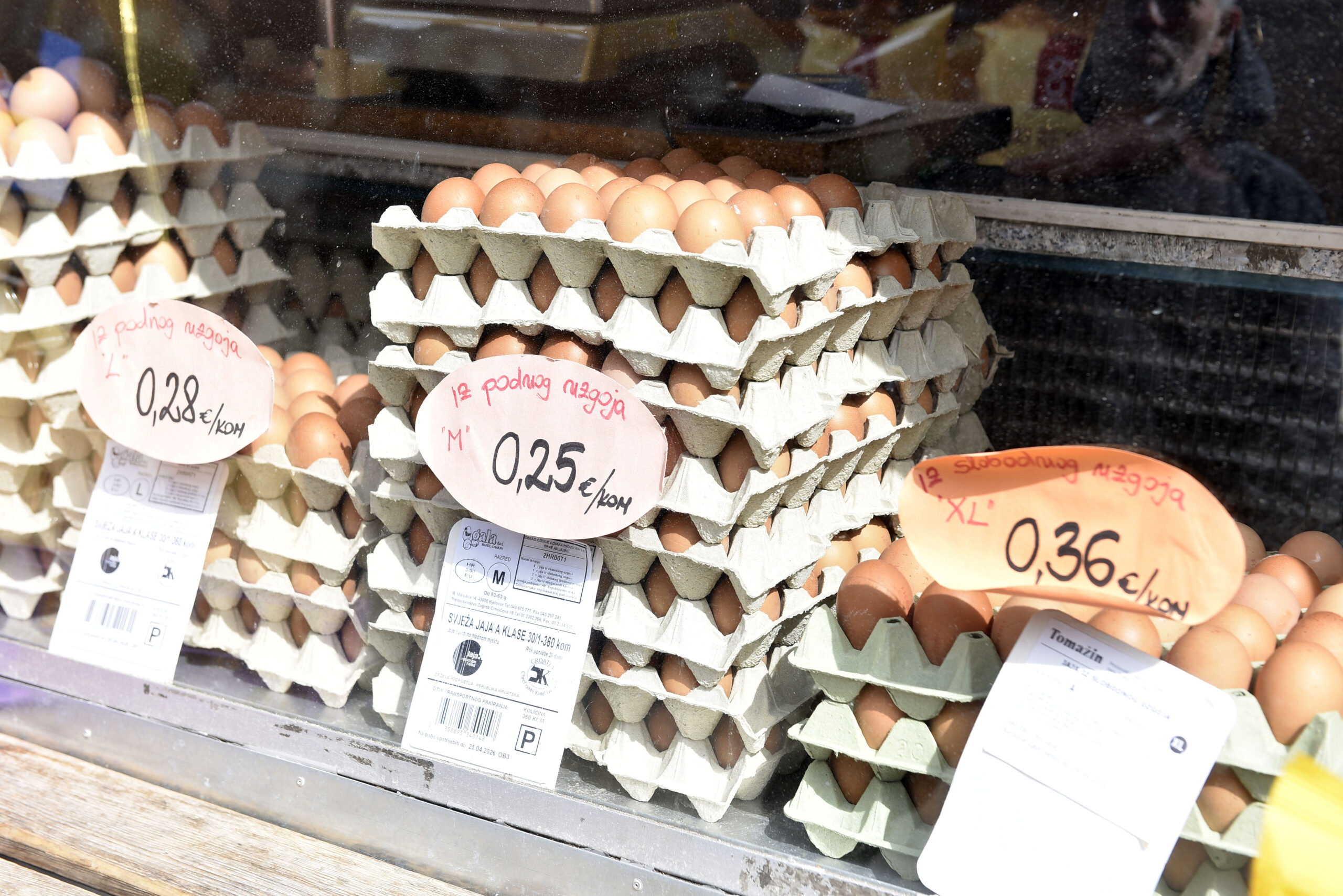 Osim šunkice po 13,5 eura mogu se naći i one po cijeni od oko 8 eura po kilogramu, objašnjavaju prodavači da je u pitanju razlika u kvaliteti. Potražnja za jajima još nije dostigla vrhunac, a cijena im se kreće od 2,50 do 4 eura.
