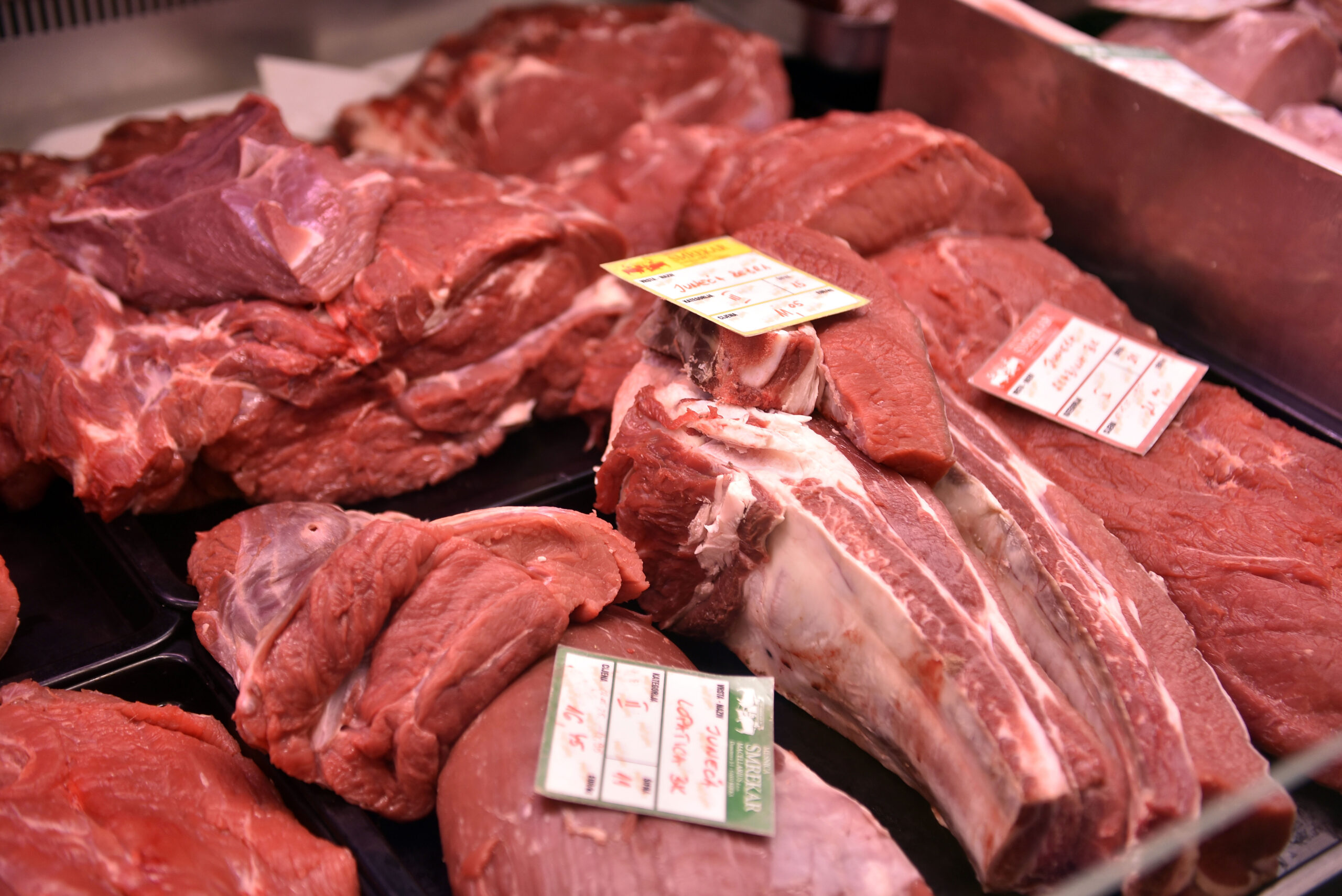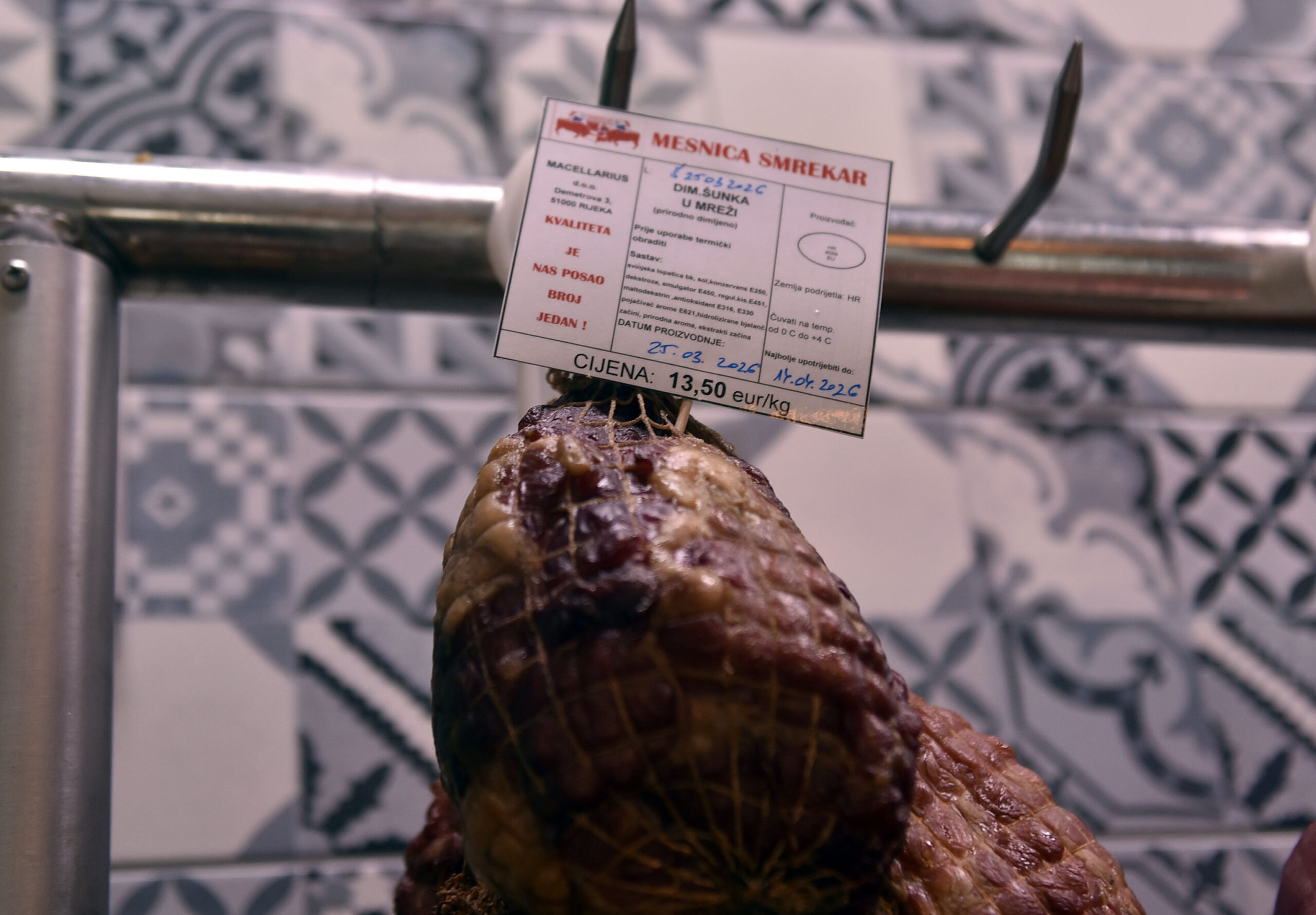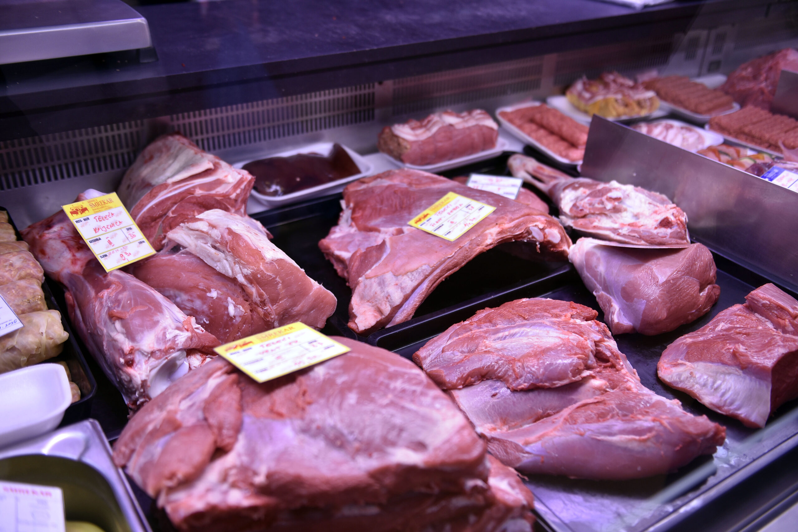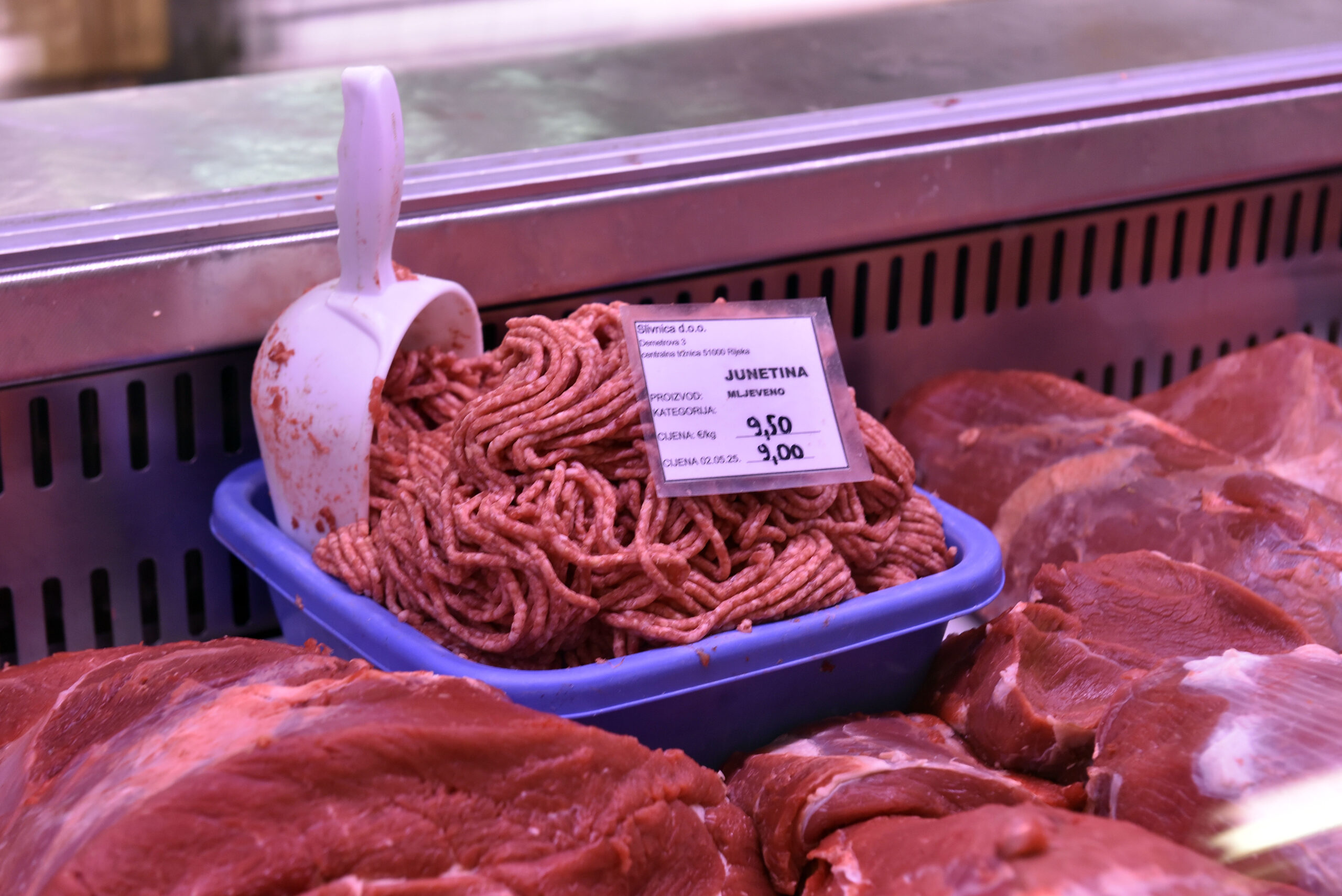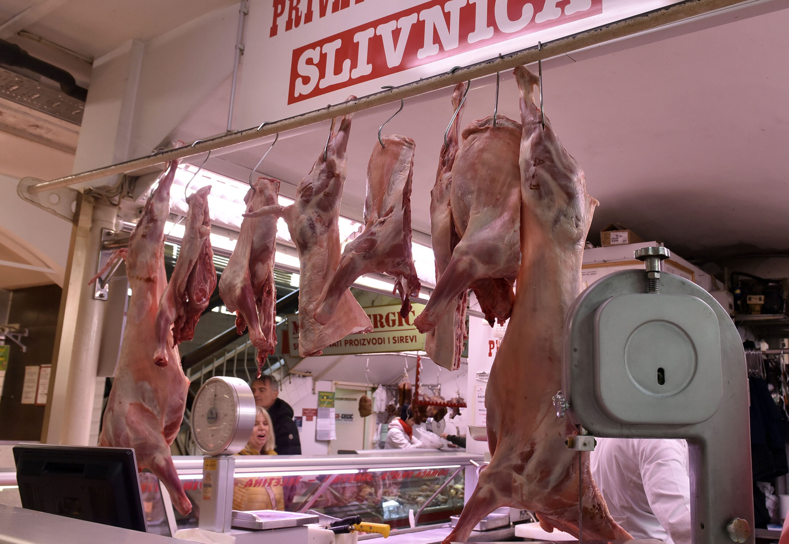 U »mesnom paviljonu« drugačija slika. Ima janjetine i to vidno izložene za 20 eura po kilogramu. Dok jedan prodavač kaže da se navala kupaca tek očekuje, u drugoj mesnici kažu da je već počela, što pokazuju i gužve. Idu i šunkice po 13,4 eura, a i kobasice.