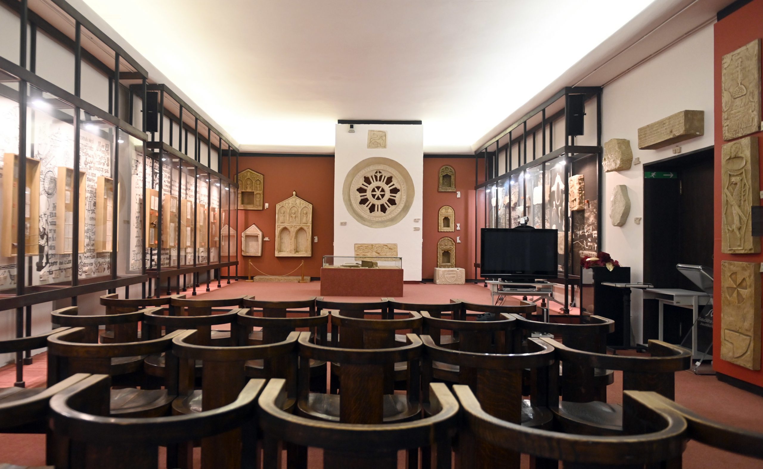 U dvorani izložbe nalaze se zidne vitrine s izlošcima te dvije stolne vitrine, a na čelnom i začelnom zidu glagoljski kameni spomenici Istre i Hrvatskog primorja, kao i replike fresaka s glagoljskim zapisima i natpisima.
