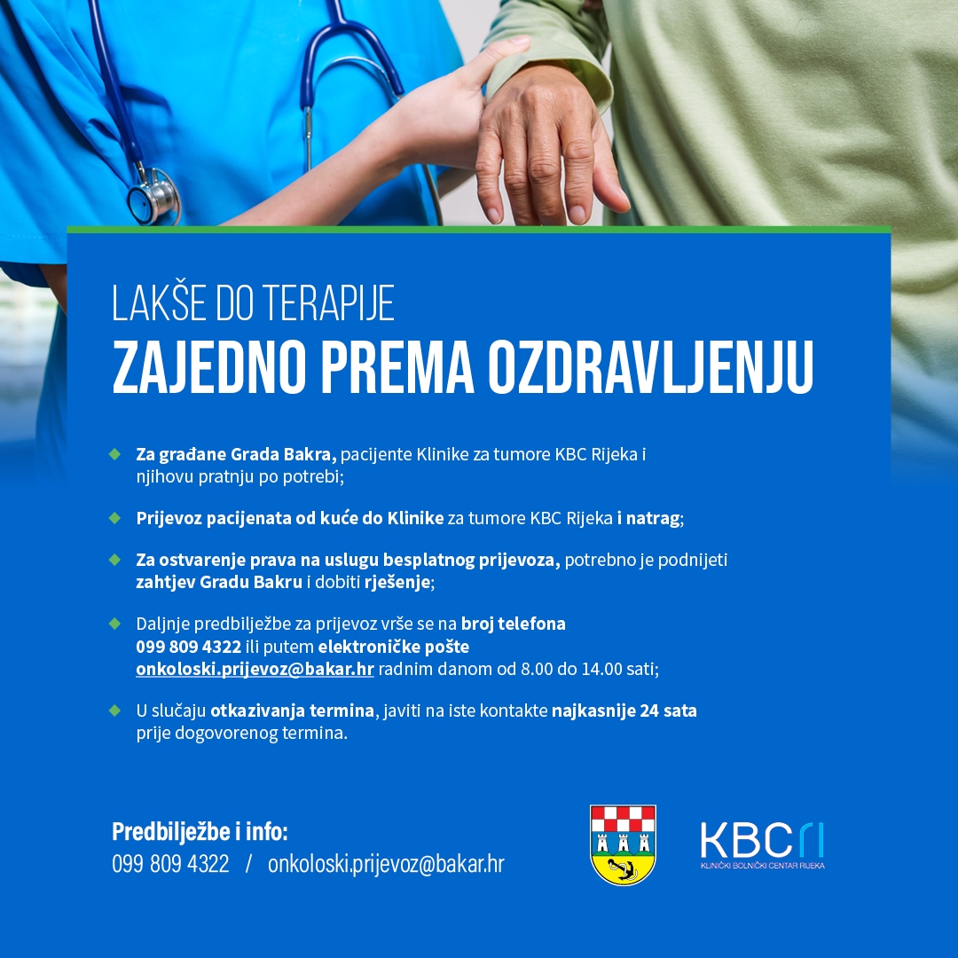 Riječ je o novoj usluzi kojom se osigurava prijevoz pacijenata od kućne adrese do KBC-a Rijeka, odnosno Klinike za tumore, i natrag, uz mogućnost pratnje ukoliko je pacijentu potrebna, istaknuli su iz Grada Bakra.