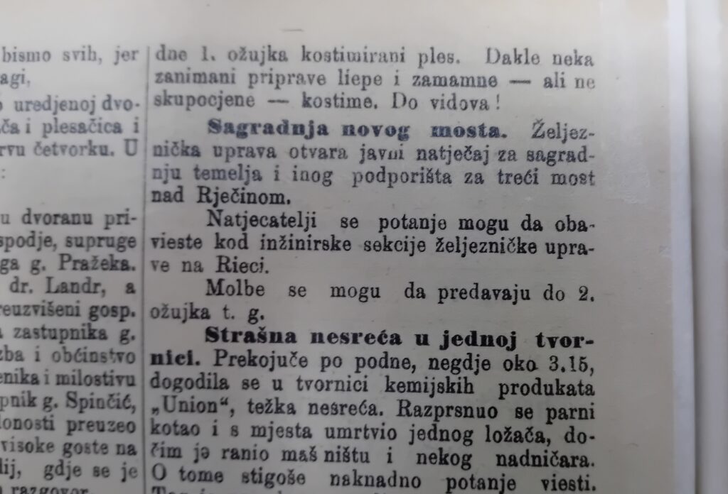 Objave iz 1908. o gradnji mosta i natječaju u dnevnicima La Bilancia (17.2.) i Novi list (18.2.)
