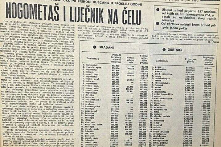 Nogometaš prvi na listi, pekar odmah - iza. Ovako su Riječani zarađivali 1979.