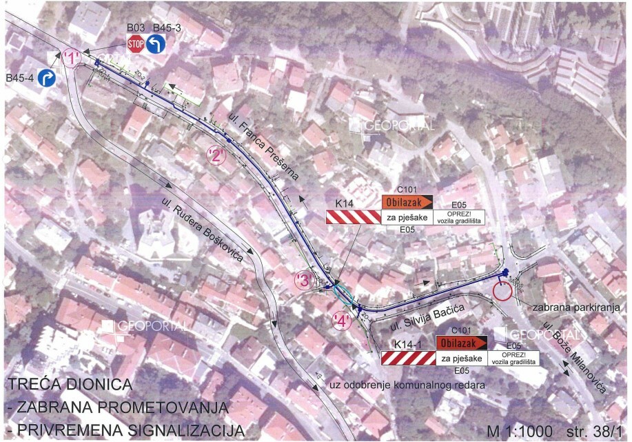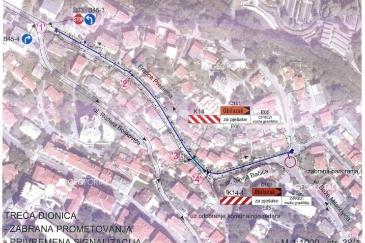 Komunalno društvo Vodovod i kanalizacija d.o.o. obavještava građane da će se, zbog izvođenja radova na zamjeni vodovodnih instalacija, u razdoblju od 19. do 22. studenoga u vremenu od 9 do 15 sati, privremeno zatvoriti za sav promet ulica Franca Prešerna i ulica Silvija Bačića (od kućnog broja 1 do kućnog broja 15).
