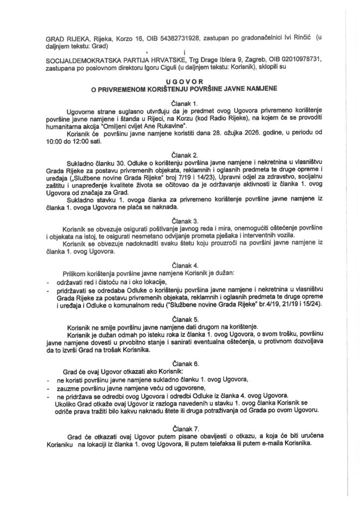 – Tako su postupajući u dobroj vjeri i maksimalno konstruktivno, sve prethodno navedene radnje odrađene u najkraćem mogućem roku te je ugovor sastavljen i otpremljen stranci elektroničkom poštom, odmah sljedećeg dana od potpunjavanja zahtjeva, odnosno u petak 27. ožujka 2026. godine. Grad je dakle pokazao maksimalnu žurnost u postupanju te je prepoznao ovu aktivnost kao značajnu za Grad na način da je korištenje javne površine odobreno bez naknade temeljem Odluke o korištenju površina javne namjene i nekretnina u vlasništvu Grada Rijeke za postavu privremenih objekata, reklamnih i oglasnih predmeta te druge opreme i uređaja. Također, odmah u četvrtak 26. ožujka 2026. godine, po primitku dopunjenog zahtjeva koji se odnosio na korištenje štanda, paralelno s pripremom ugovora, izdan je i pisani nalog izvođaču za postavu štanda u zatraženo vrijeme, a zbog kratkog roka stručne službe su na isto podsjetile izvođača i u petak 27. ožujka 2026. godine telefonskim putem. Naime, gradski štandovi na površini javne namjene postavljaju se sukladno odredbama ugovora kojeg Grad Rijeka u tu svrhu sklapa s ugovornim izvođačem, odnosno Grad Rijeka u slučaju potrebe za postavom štanda na javnoj površini izdaje nalog ugovornom izvođaču za njegovu postavu. U konkretnom slučaju, iako su sve predradnje sa strane Grada izvršene, izvođač nije postupio sukladno izdanom nalogu, odnosno na dan održavanja humanitarne akcije štand se nije nalazio na zatraženom mjestu, pojašnjavaju u Gradu Rijeci.