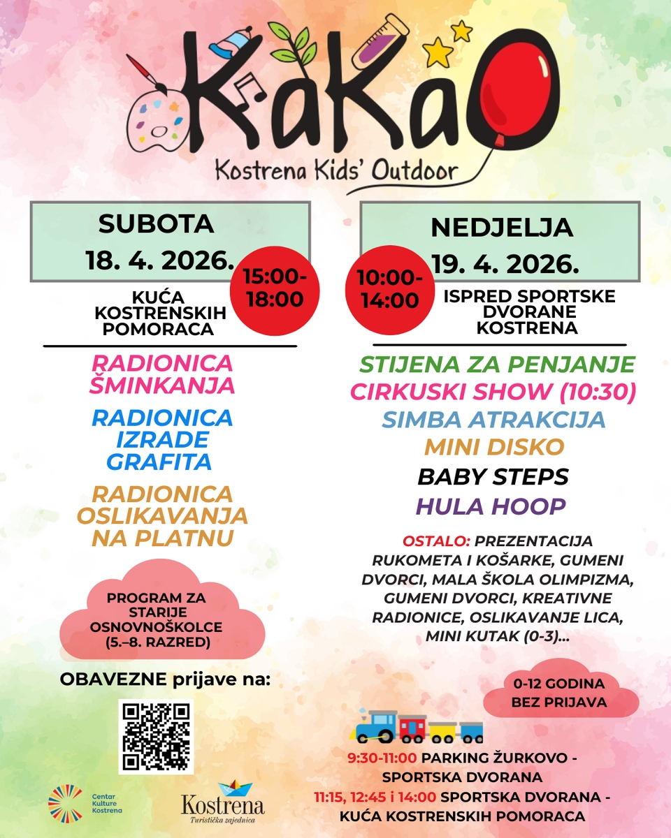 U nedjelju, 19. travnja 2026. godine, program se seli ispred Sportske dvorane Kostrena, gdje djecu u dobi od 0 do 12 godina očekuje bogat sportski i zabavni sadržaj.