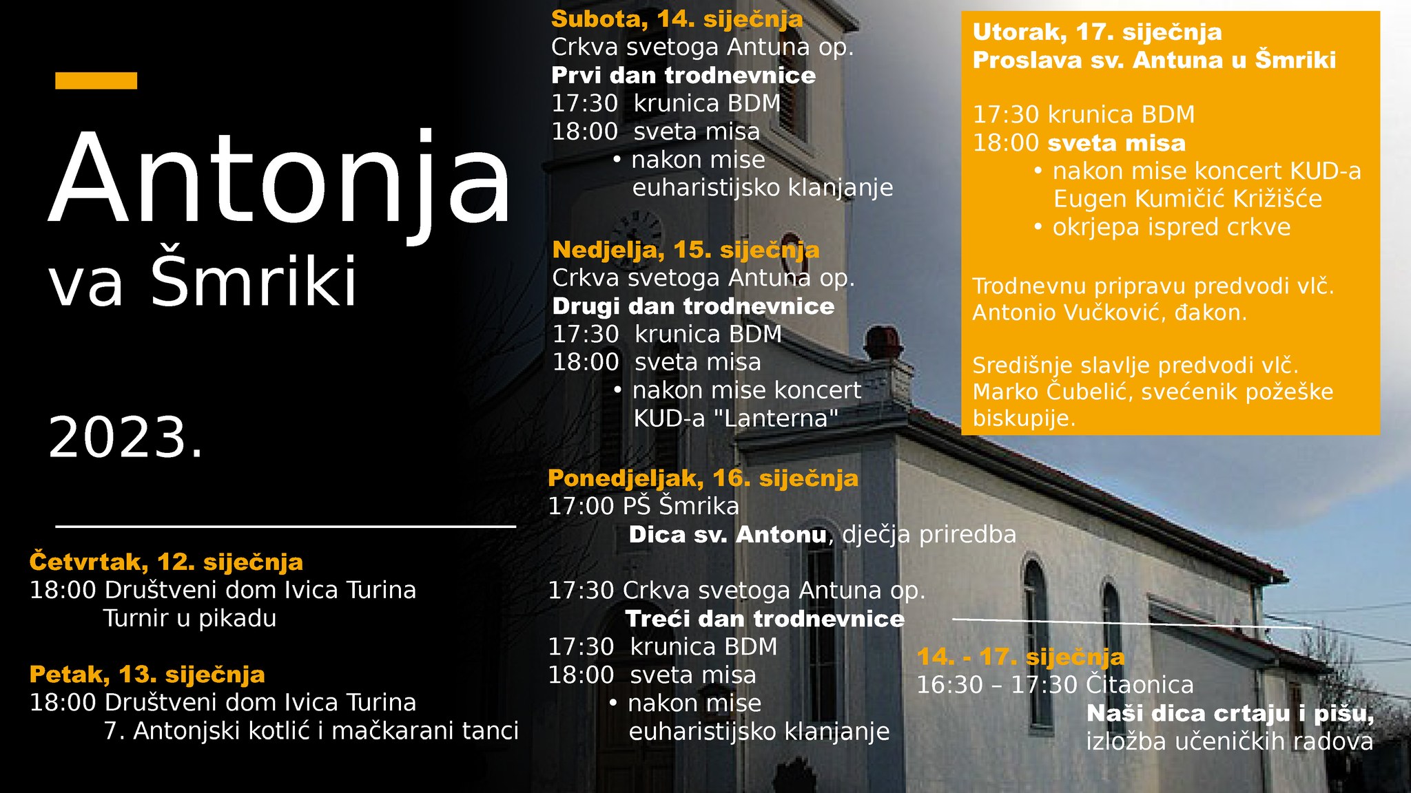 U nedjelju nakon mise najavljen je koncert KUD-a Lanterna. U ponedjeljak, 16. siječnja u 17 sati u Područnoj školi Šmrika bit će održana dječja priredba pod nazivom “Dica sv. Antonu”.