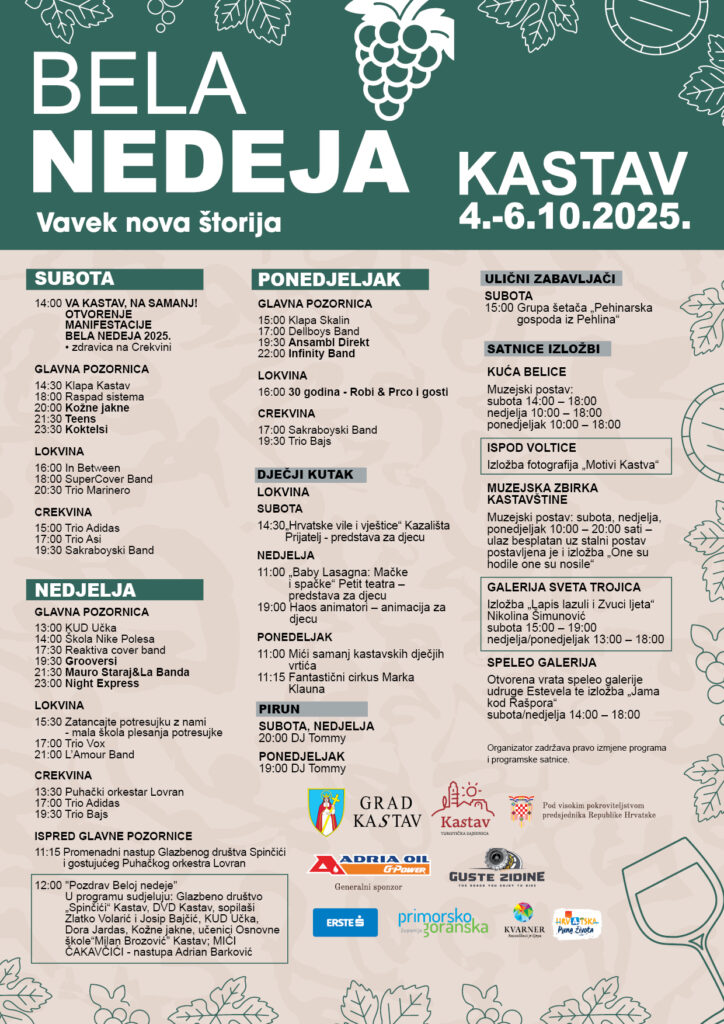 Zbog najave lošeg vremena sutrašnji program Pozdrav Beloj nedeje u Kastvu će se održati na glavnoj pozornici u 15 sati umjesto u podne kako je najavljeno u programu, obavijestili su organizatori.