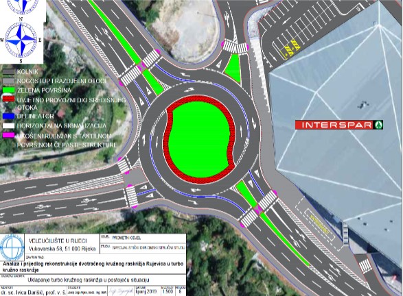 Turbo kružna raskrižja prvi su put primijenjena krajem prošlog stoljeća u Nizozemskoj, a od običnih se razlikuju po tome što su prometni trakovi kružnog kolnika međusobno odvojeni nadvišenim rubnjacima. Vozači na vrijeme moraju odabrati prometni trak za smjer u kojem žele ići jer se on u rotoru više ne može promijeniti. Time će se uvelike smanjiti broj mogućih konfliktnih točaka, mjesta na kojima postoji mogućnost sudara dvaju vozila, kojih je sada na ovom rotoru čak dvadeset i četiri, usmjeravanjem vozila u određenu traku na rotoru već pri samom ulasku u njega. Tako će vozači koji dolaze, primjerice iz smjera grada, Ulicom Antuna Kosića Rika, prije ulaska u rotor morati odabrati krajnju desnu prometnu traku žele li nastaviti kretanje prema Viškovu ili Intersparu, odnosno srednju traku ukoliko žele nastaviti vožnju prema zaobilaznici. Slično je rješenje već primijenjeno na rotoru na spoju riječke zaobilaznice, Jadranske magistrale i priključne ceste za Krčki most, gdje se pokazalo učinkovitim.