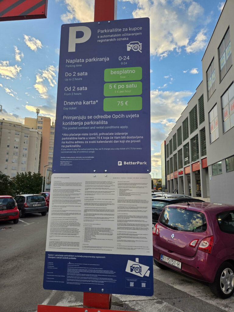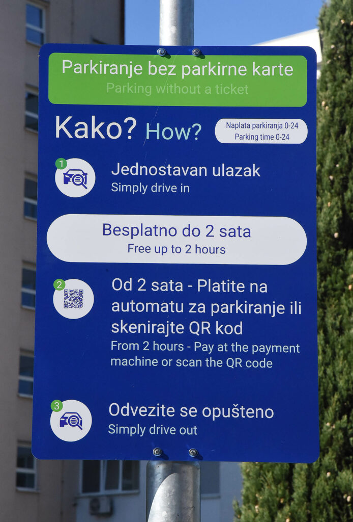 Sustav naplate trebao bi krenuti za koji dan, a parkiralište za kupce radit će po principu automatskog očitovanja registarskih oznaka. Naplata parkiranja provodit će se tijekom cijeloga dana, točnije od 0 do 24 sata. Prva dva sata bit će besplatna, a potom će cijena za svaki sljedeći sat iznositi pet eura po satu. Dnevna karta je 75 eura, a toliko će morati platiti i građanin koji nakon dva sata ostavi svoj automobil na parkingu i ne plati ga. Naime, kako piše u odredbama općih uvjeta korištenja parkirališta, ako plaćanje nije obavljeno, građanin prihvaća izdavanje parkirališne karte od 75 eura, koja će mu biti dostavljena na kućnu adresu i to za svaki kalendarski dan koji je automobil bio parkiran na parkiralištu. Ulazak na parking je jednostavan, kao i do sada. Parkiranje se, nakon prva dva besplatna sata, može platiti na automatu za parkiranje, koji se nalazi na ulazu u centar ili skeniranjem QR koda. |