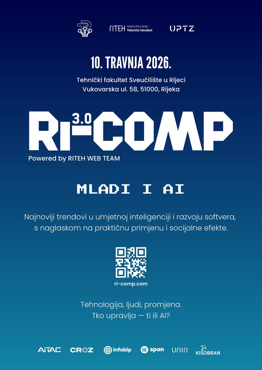 RIJEKA – Tehnički fakultet Sveučilišta u Rijeci bit 10. travnja s početkom u 13 sati domaćin konferencije Ri-Comp 3.0: Mladi i AI. Riječ je o konferenciji koja okuplja studente, developere i stručnjake iz industrije s ciljem razumijevanja stvarnog utjecaja umjetne inteligencije na računarstvo i svakodnevni inženjerski rad.