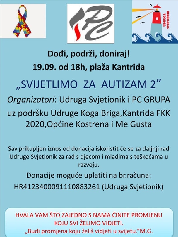 Udruga Svjetionik akciju Svijetlimo za autizam pokrenula je prošle godine, akcija je održana 2. travnja na Svjetski dan svjesnosti o autizmu, ali kako je 2. travnja ove godine upao točno u jeku svih mogućih restrikcija izazvanih koronakrizom, u Svjetioniku su odlučili malo prolongirati njezino održavanje i sačekati neki malo povoljniji trenutak.