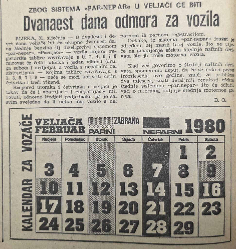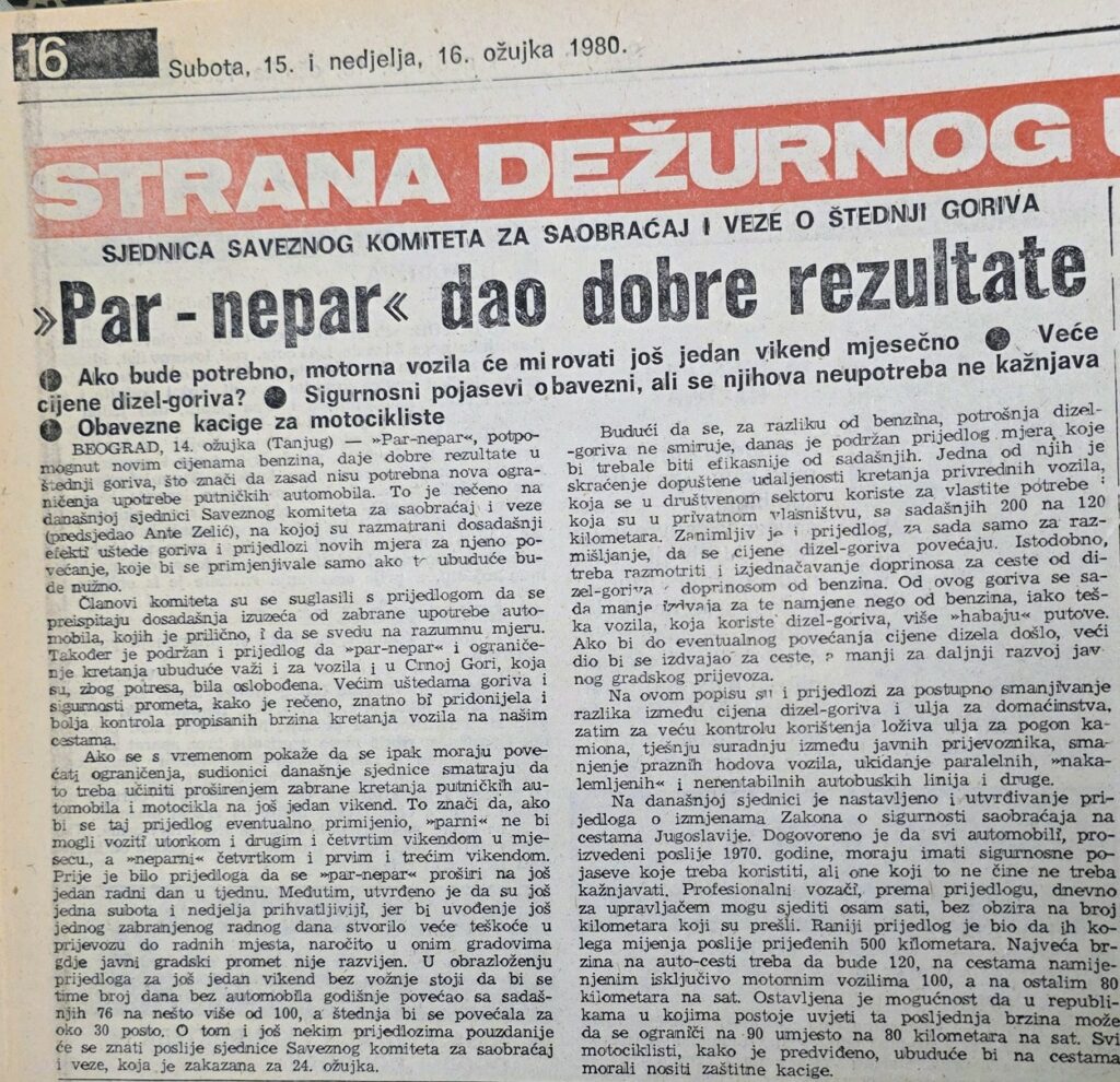 “Par-nepar”, potpomognut novim cijenama benzina, daje dobre rezultate u štednji goriva, što znači da zasad nisu potrebna nova ograničenja putničkih automobila – prenio je Novi list u ožujku 1980. Tanjugovu informaciju sa sjednice Saveznog komiteta za saobraćaj i veze na kojoj su razmatrani efekti uštede goriva i prijedlozi novih mjera za njezino povećanje nakon uvođenja izvanredne mjere koja je u kolektivnoj memoriji ostala zapamćena pod jednostavnim imenom: par-nepar.