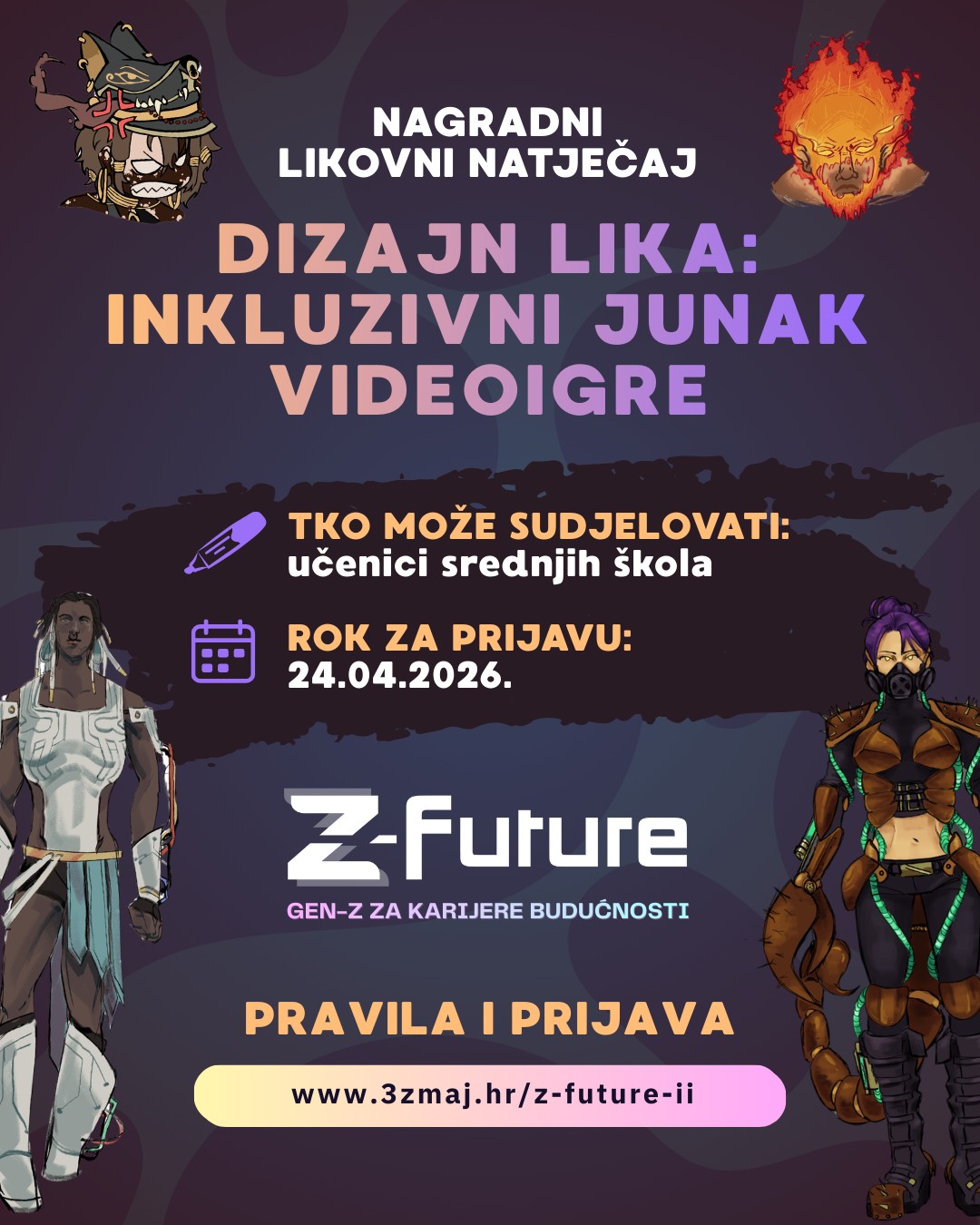 RIJEKA – U sklopu projekta »Z-FUTURE II: GenZ za karijere budućnosti«, Udruga 3. zmaj raspisala je kreativni likovni i literarni natječaj pod nazivom »Dizajn lika: Inkluzivni junak videoigre«, koji poziva srednjoškolce iz cijele Hrvatske da pokažu svoju kreativne vještine.