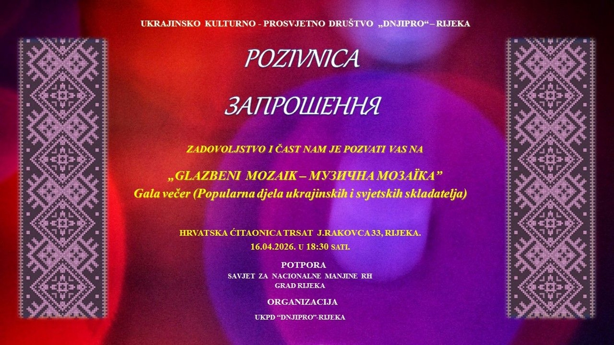 Ukrajinsko kulturno-prosvjetno društvo Dnjipro-Rijeka u četvrtak, 16. travnja u Hrvatskoj čitaonici Trsat (J. Rakovca 33), u 18.30 sati upriličuje “Glazbeni mozaik”, gala večer popularnih djela ukrajinskih i svjetskih skladatelja.