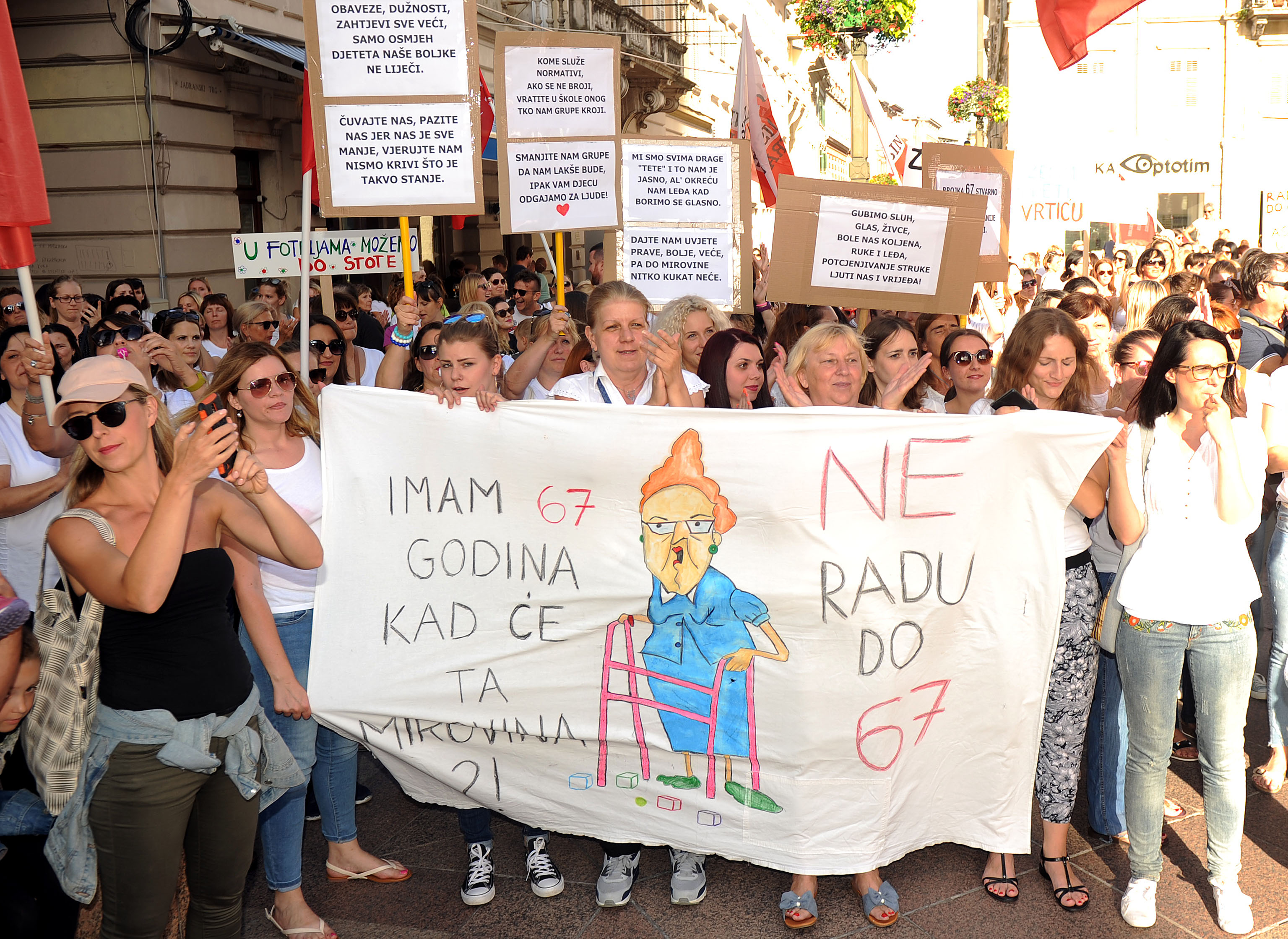RIJEKA »Što biste vi bez nas?«, »I kvalitetan čoban zna kada je previše ovčica«, »U foteljama možemo do stote«, »Ukrali ste nam mirovine, ne damo vam našu starost«, »Kad dijete padne, tko će se sagnuti«, »Ne želimo umrijeti u vrtiću«, »Odgajatelj sam, nisam teta«, »Ja nisam neradnik«, »Dostojanstven rad = dostojanstveno djetinjstvo«, dio je transparenata koji su se mogli pročitati na Jadranskom trgu, koji su popunili odgojitelji, sudionici prosvjeda pod nazivom »Za dostojanstven rad i starost – ne radu do 67«, za koji su inicijativu na Facebooku pokrenuli zaposlenici u predškolskim ustanovama diljem Hrvatske, a organizaciju je na sebe preuzeo Sindikat obrazovanja, medija i kulture Hrvatske (SOMK), udružen SSSH.