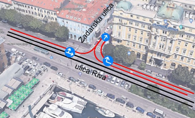 – Promet smjera zapad-istok svodi se na dva južna traka ulice Riva do zgrade Transadrije gdje novo kružno raskrižje omogućava nastavak u smjeru istoka, desno skretanje za tržnicu i lukobran.