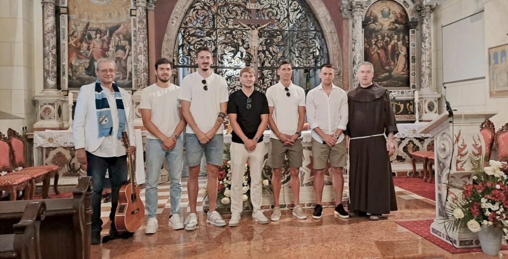 Bila je nedjelja, 20. srpnja. Našli smo se ispred njegove kuće na Vojaku – “Pazi kad dolaziš jer sve je raskopano, aglomeracija.” – i automobilom otišli do parkirališta ispred Aule Trsatskog svetišta. Armada je pokrenula, sa željom da postane tradicija, organizaciju svete mise posvećene svim igračima i navijačima, svima koji vole “Rijeku”.