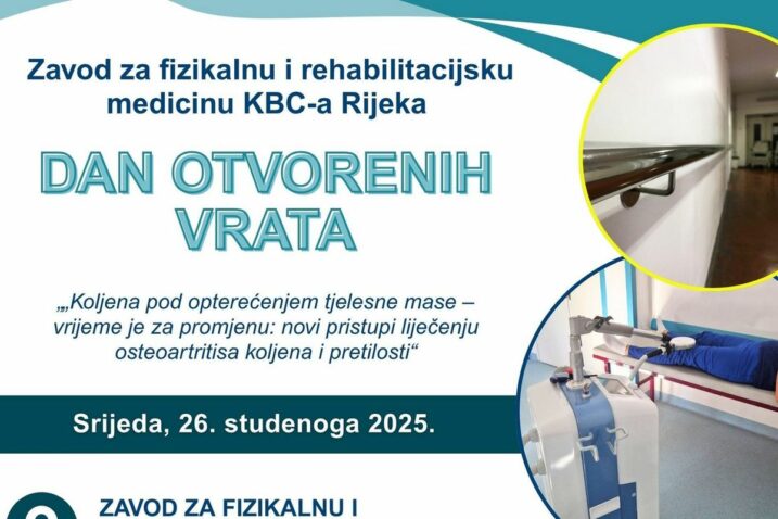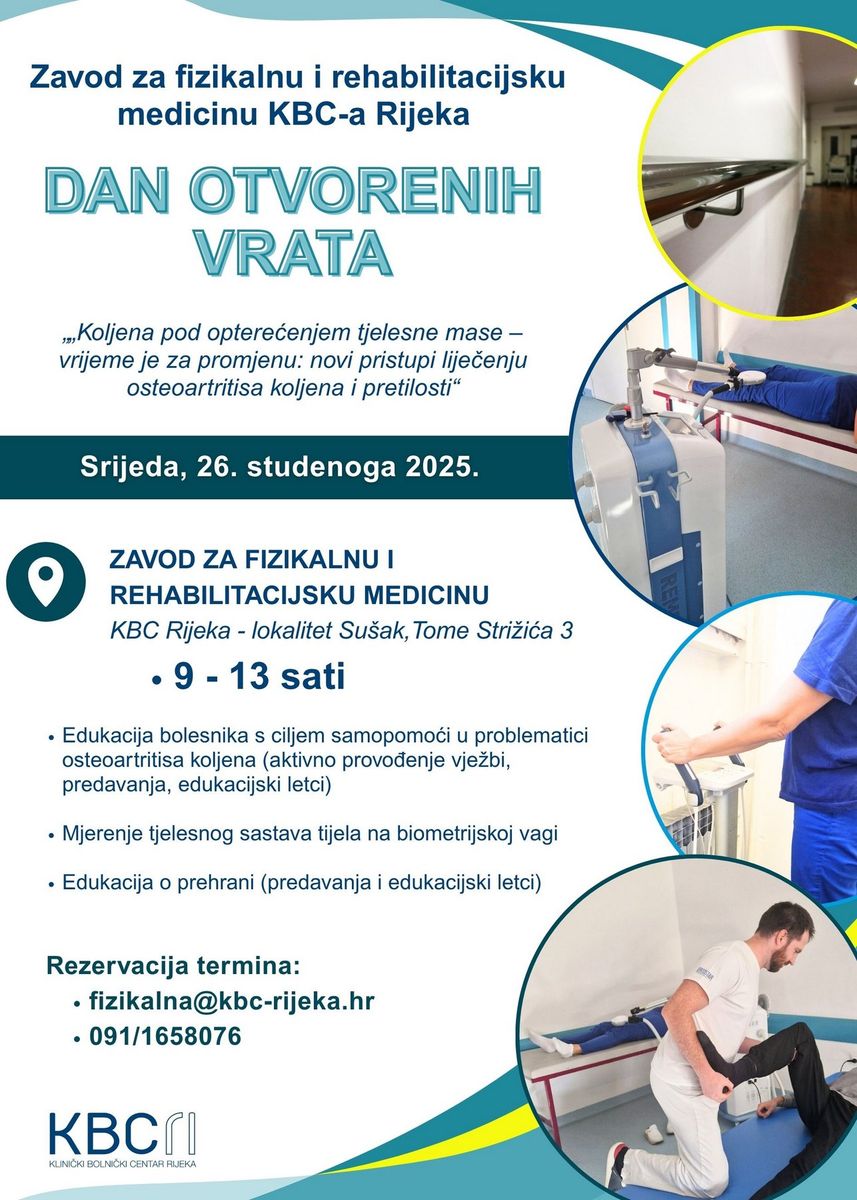 Zavod za fizikalnu i rehabilitacijsku medicinu KBC-a Rijeka organizira Dan otvorenih vrata pod nazivom „Koljena pod opterećenjem tjelesne mase – vrijeme je za promjenu“, koji će se održati u srijedu, 26. studenoga, od 9 do 13 sati, u prostorima Zavoda na lokalitetu Sušak, na adresi Tome Strižića 3, Rijeka.