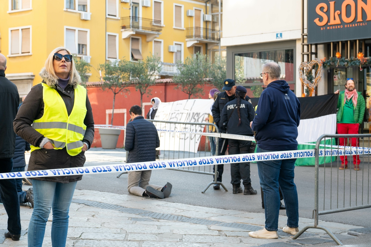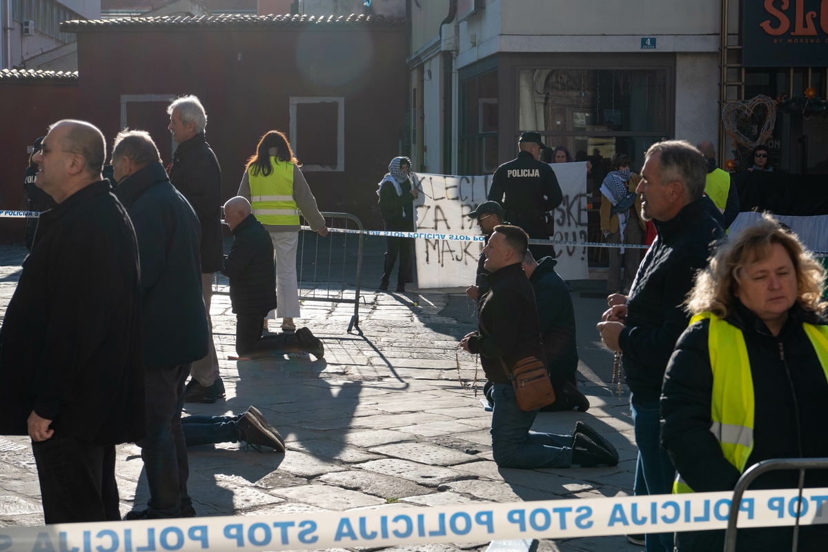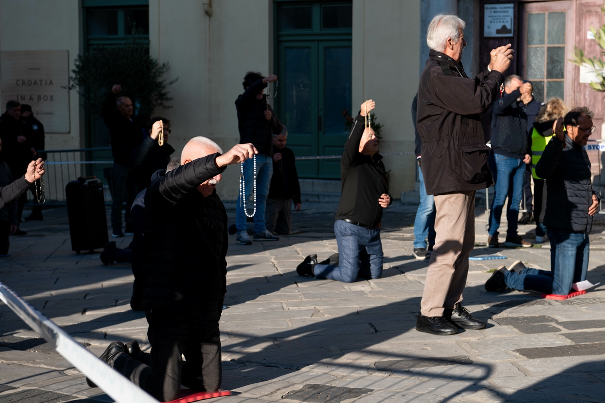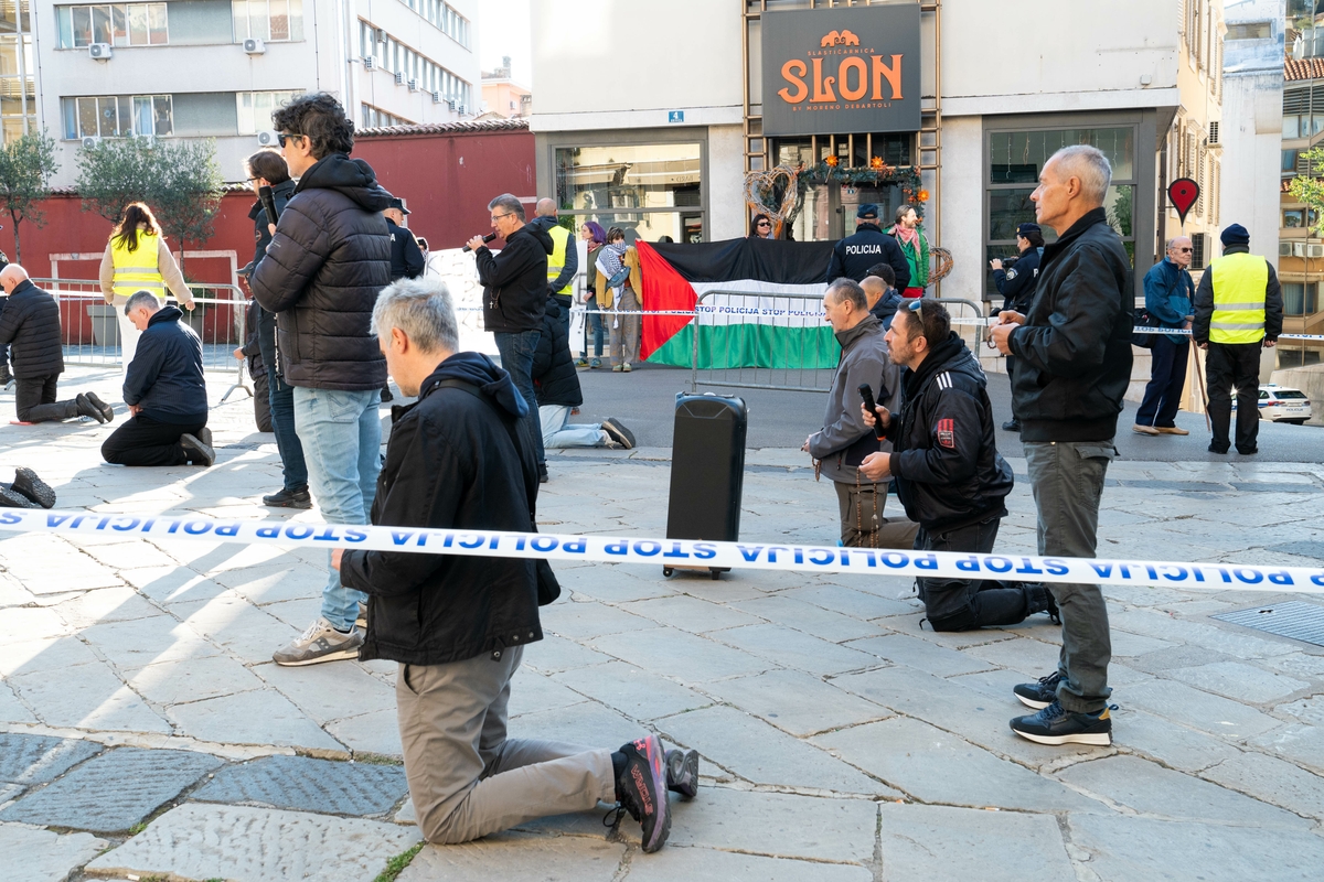 Prosvjednici su jutros na trgu Grivica u Rijeci dočekali klečitelje s istaknutom palestinskom zastavom i transparentom “Klečite li za palestinske majke i djecu?”.