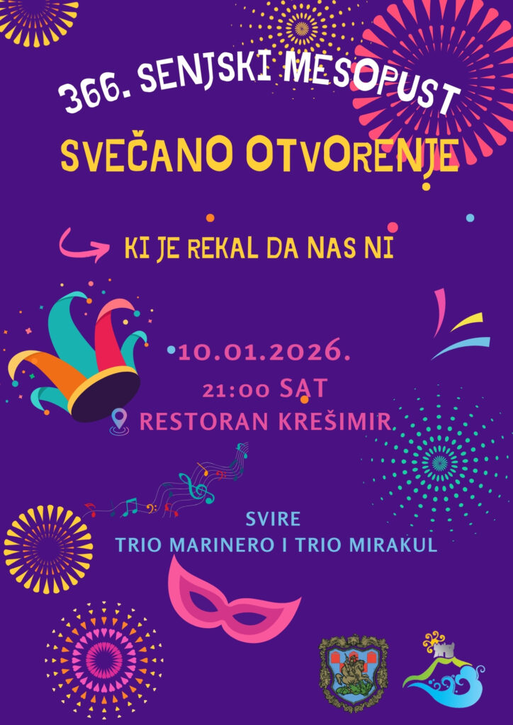 SENJ- U subotu 10. siječnja svečanim otvorenjem započinje 366. Senjski mesopust, jedna od najdugovječnijih tradicija grada Senja. Maškarana povorka kreće s Pavlinskog trga u 20:50 , a u 21:00 sat uz prigodni program u restoranu Krešimir ovogodišnji mesopust će se svečano otvoriti.Za dobru glazbenu atmosferu pobrinut će se grupe Trio Marinero i Trio Mirakul.