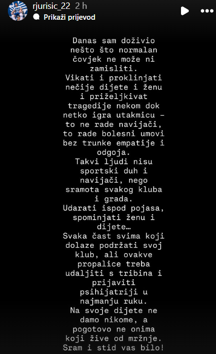 “Danas sam doživio nešto što normalan čovjek ne može ni zamisliti. Vikati i proklinjati nečije dijete i ženu i priželjkivati tragedije nekome dok netko igra utakmicu – to ne rade navijači, to rade bolesni umovi bez trunke empatije i odgoja. Takvi ljudi nisu sportski duh i nisu navijači, nego sramota svakog kluba i grada.