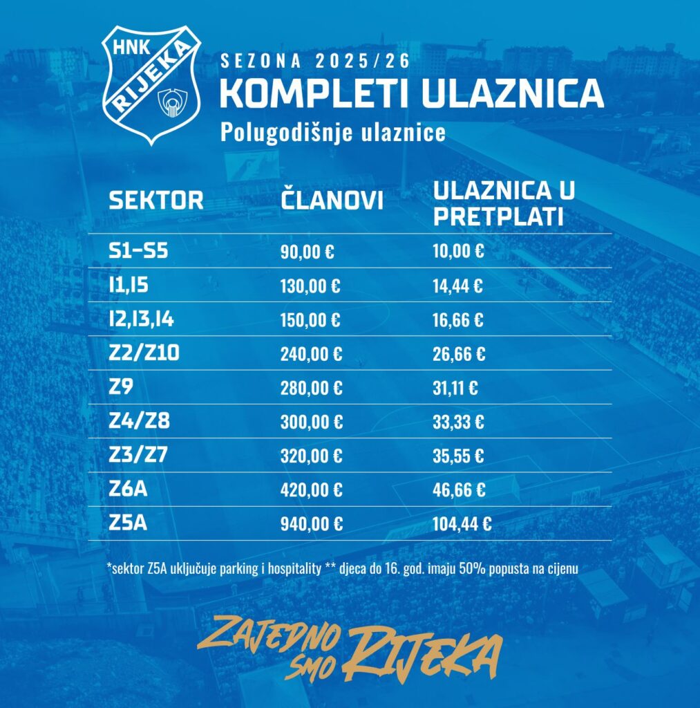 RIJEKA Prvaci Hrvatske počeli su prodaju polusezonskih pretplata za drugi dio sezone 2025./2026. Zapadne blagajne kampa HNK Rijeka Dean Šćulac s radom će početi od 19. siječnja, ali svoje mjesto na Rujevici može se osigurati i online na adresi ulaznice.nk-rijeka.hr na kojoj se mogu pogledati i cijene polugodišnjih kompleta.