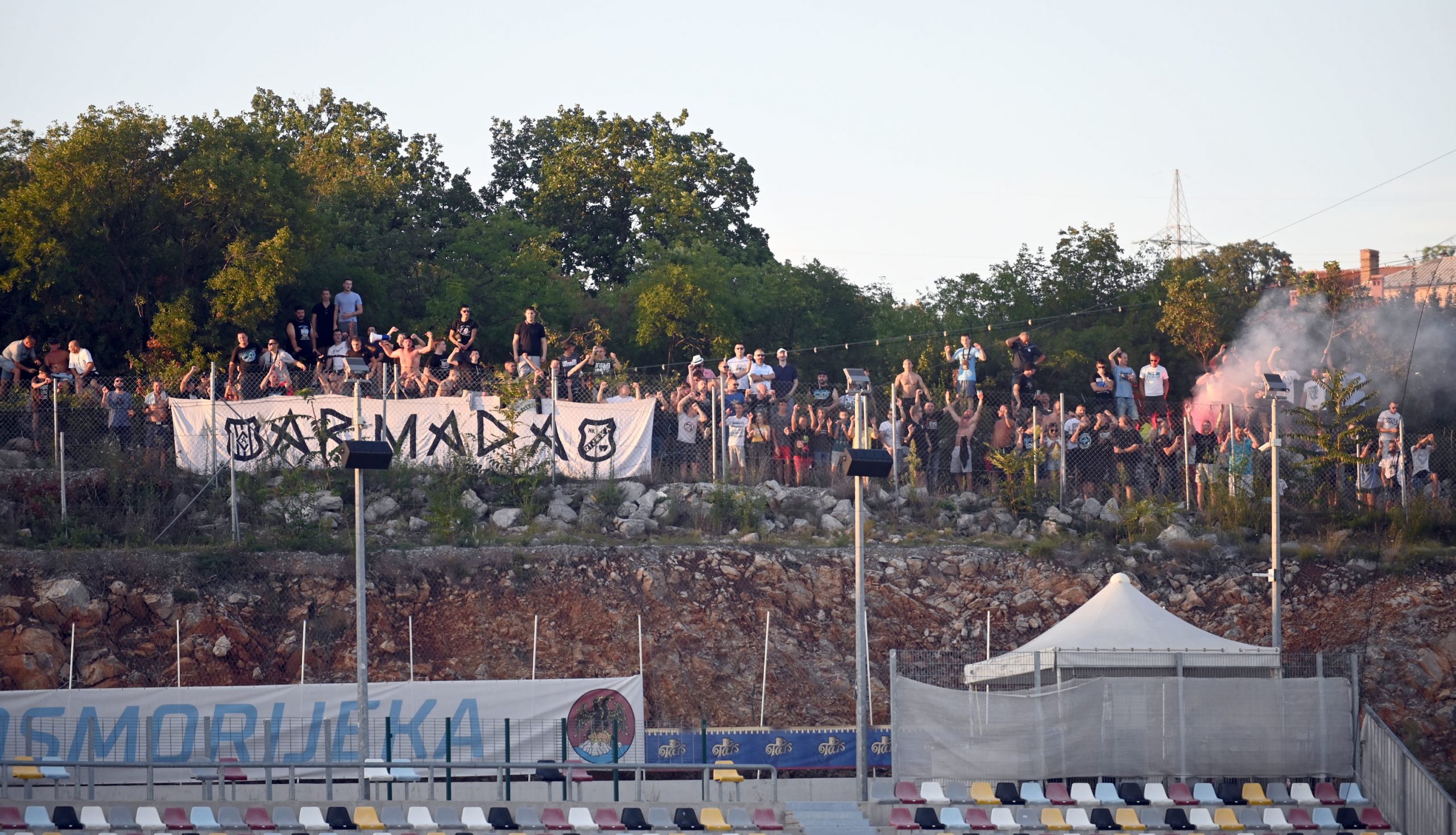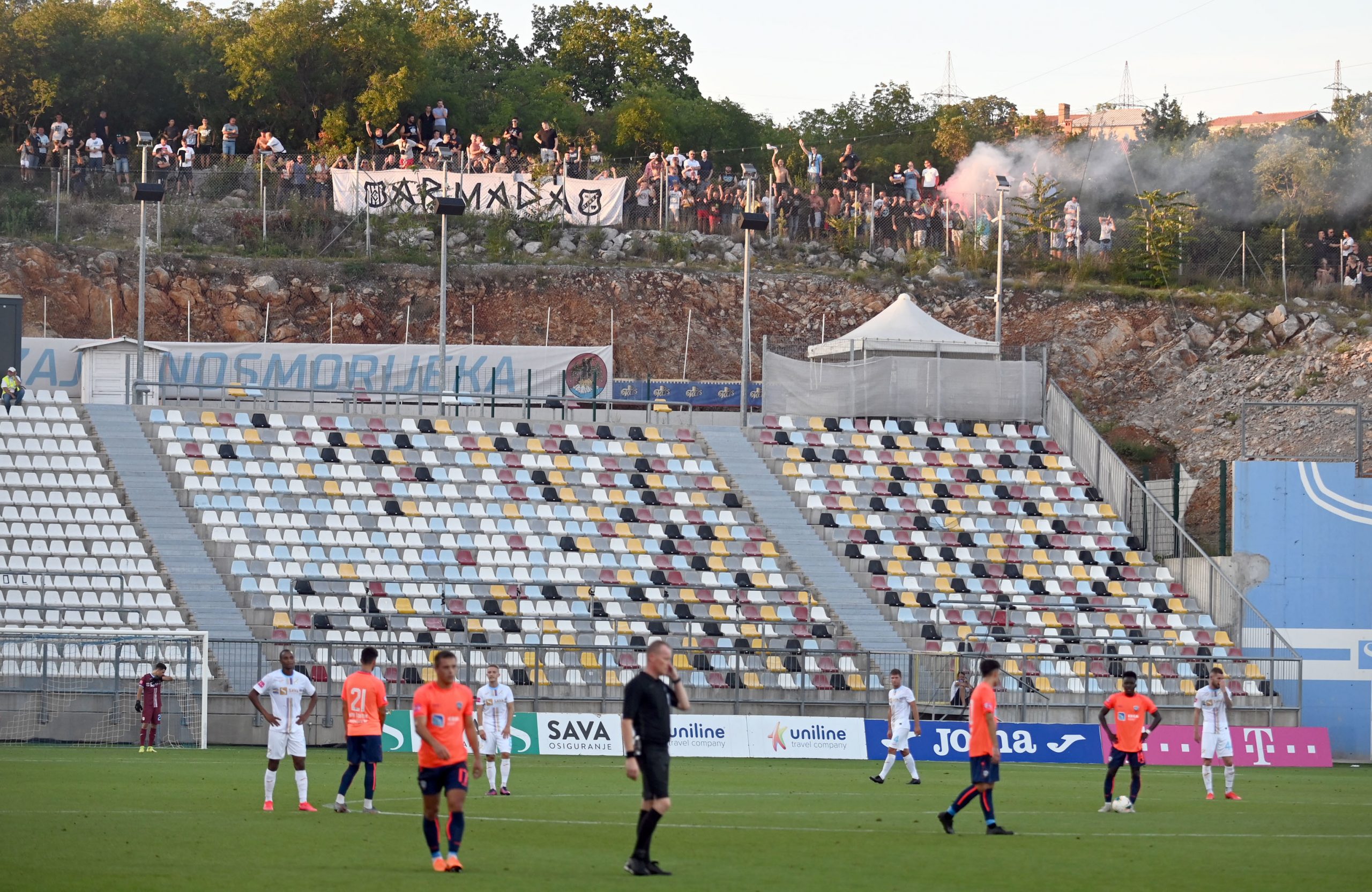 7. minuta Rijeka ponovno ima glasnu podršku najvjernijih navijača s brda iznad stadiona. Zabrana HNS-a nije ih spriječila da bodre svoj klub.