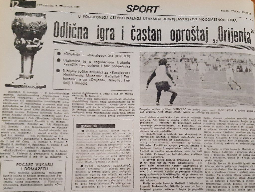 Dobar dio momčadi, koju je Orijent umalo izbacio iz Kupa (Janjoš, Radeljaš, Kapetanović, Musemić, Hadžibegić, Jozić, Božović, Merdanović…), bio je dio pobjedničkog sastava Sarajeva. A Orijent? Crveni su silno željeli ponovo među drugoligaše, no zapeli su čak četiri puta nesretno u kvalifikacijama…