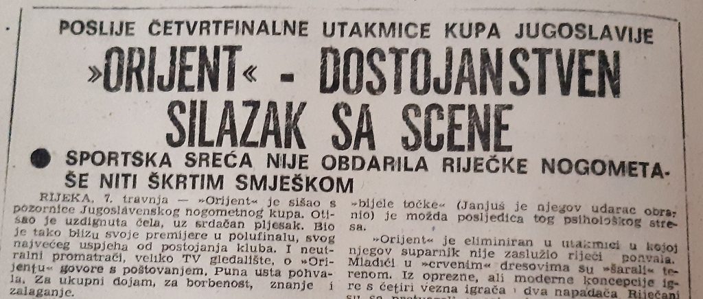 Na toj utakmici prvi put je izvedena klupska himna, koju je skladao i stihove napisao Duško Prašelj. Zanimljivo, Orijent je bio jedini hrvatski predstavnik u četvrtfinalu. Nakon utakmice su Tonko Kraljić i pokojni kolega Ivan Fabijan u Novom listu zaključili kako je to bio častan oproštaj Orijenta: »Napustili su scenu uzdignuta čela, sreća nije bila na strani Orijenta…«