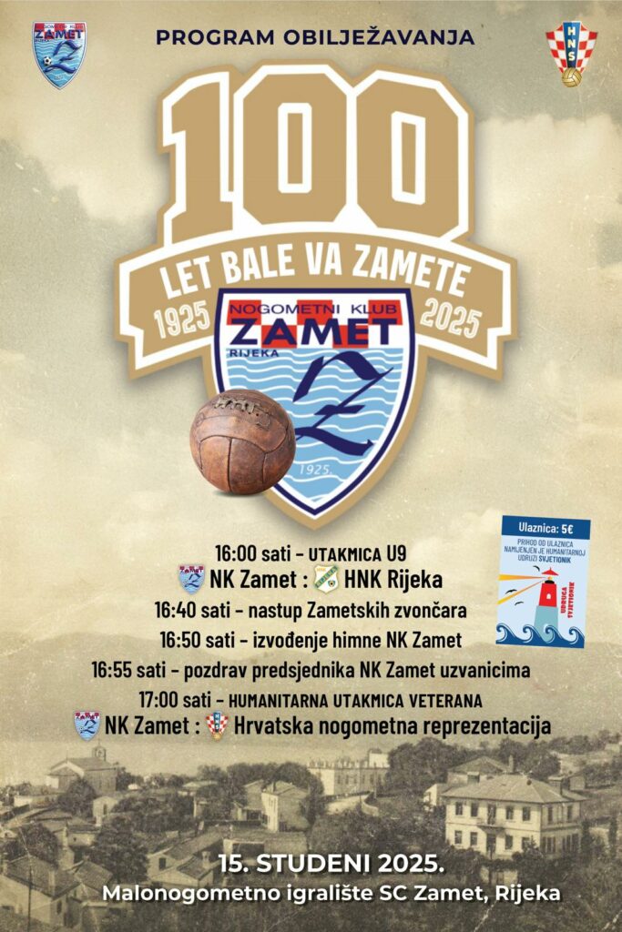 RIJEKA Sto let bale va Zamete… Tako je vodstvo NK Zameta naslovilo program proslave stote obljetnice kluba koja će se nizom aktivnosti obilježiti 15. studenog na malonogometnom igralištu s umjetnom travom kraj doma na Zametu.