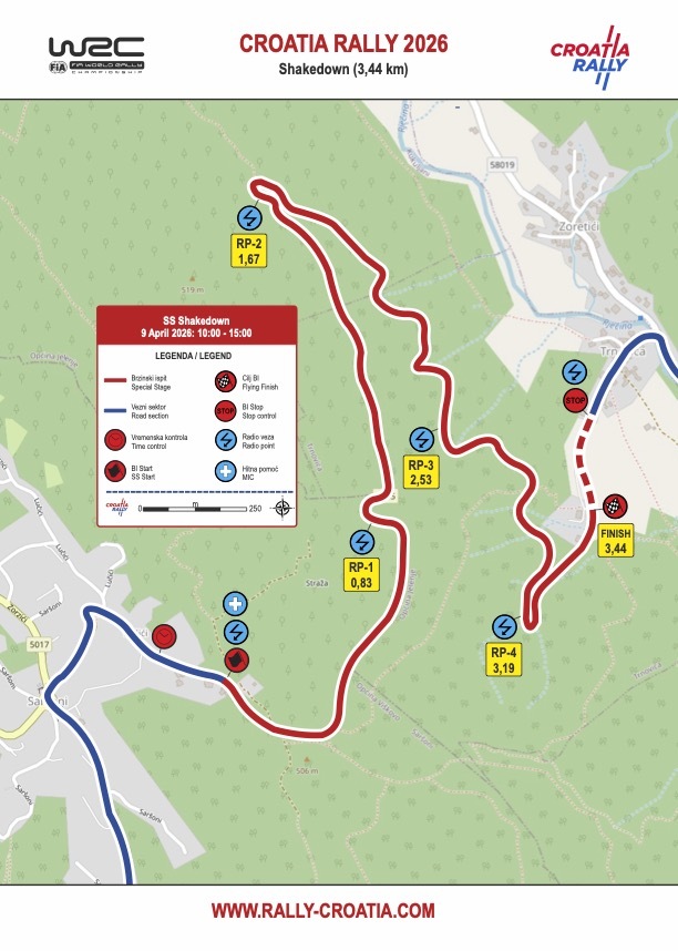 Danas je dan za »Shakedown«, vožnju kojom se testira vozilo i posada prije starta, a odvijat će se od 10 do 16 sati na dionici dugoj 3,44 kilometra, cestom od Saršona do mosta preko Rječine u Trnovici, koja će za javni promet biti zatvorena od 8 do 17.30 sati