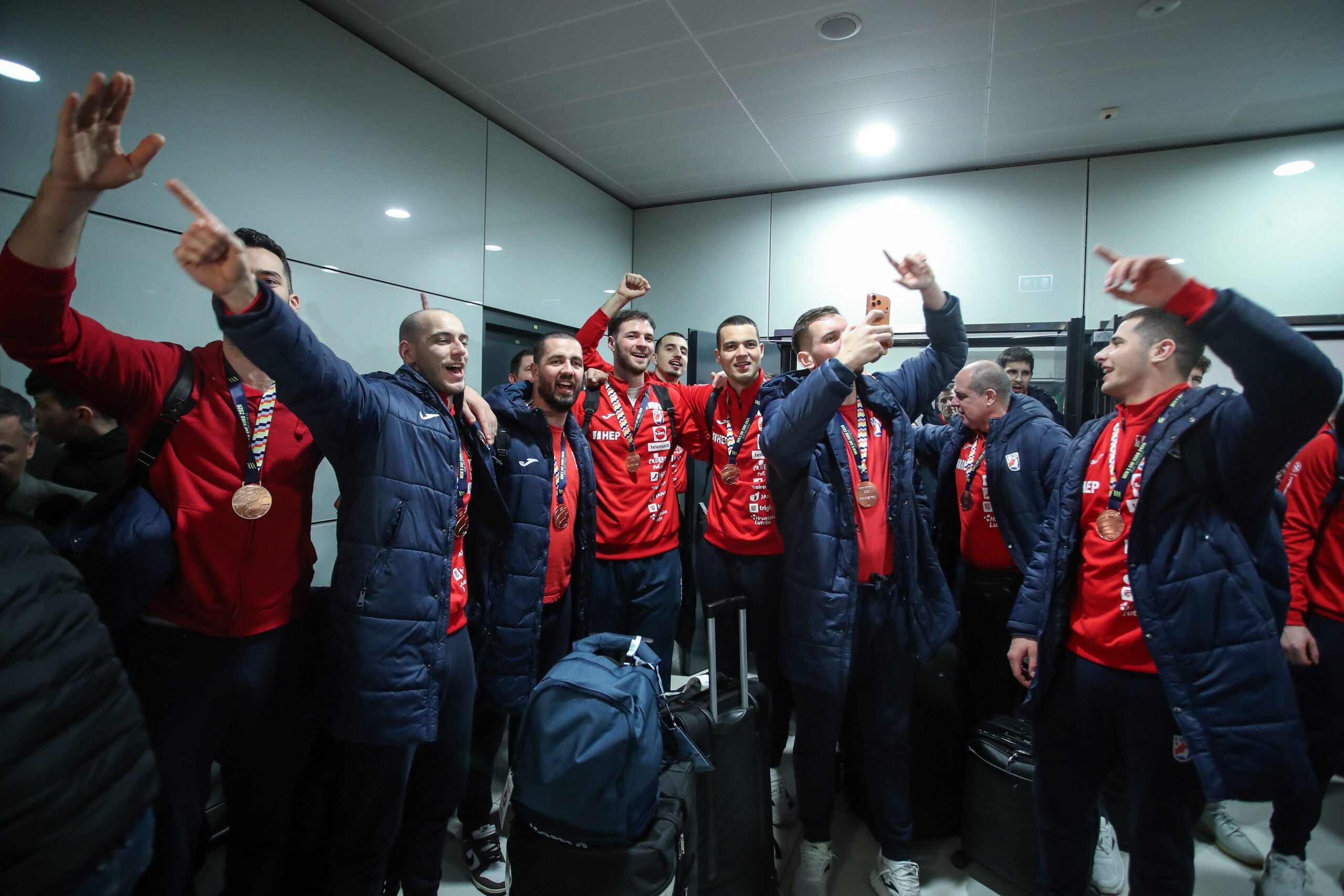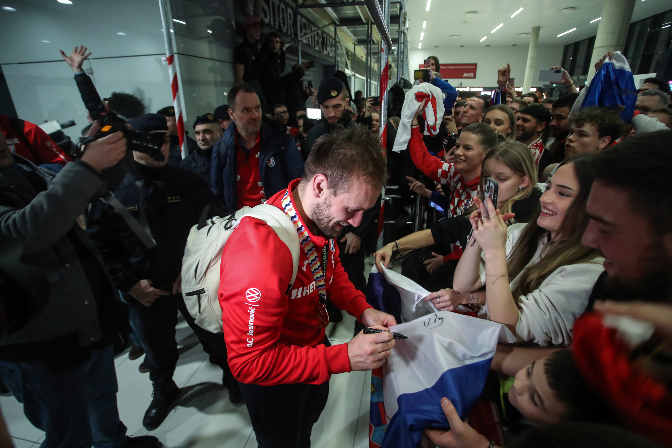 Nakon što su u Herningu osvojili europsku broncu, hrvatski rukometaši vratili su se noćas iz Danske, a u zagrebačkoj zrakoplovnoj luci Franjo Tuđman dočekalo ih je više stotina navijača.