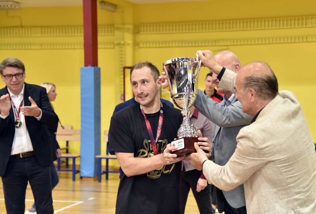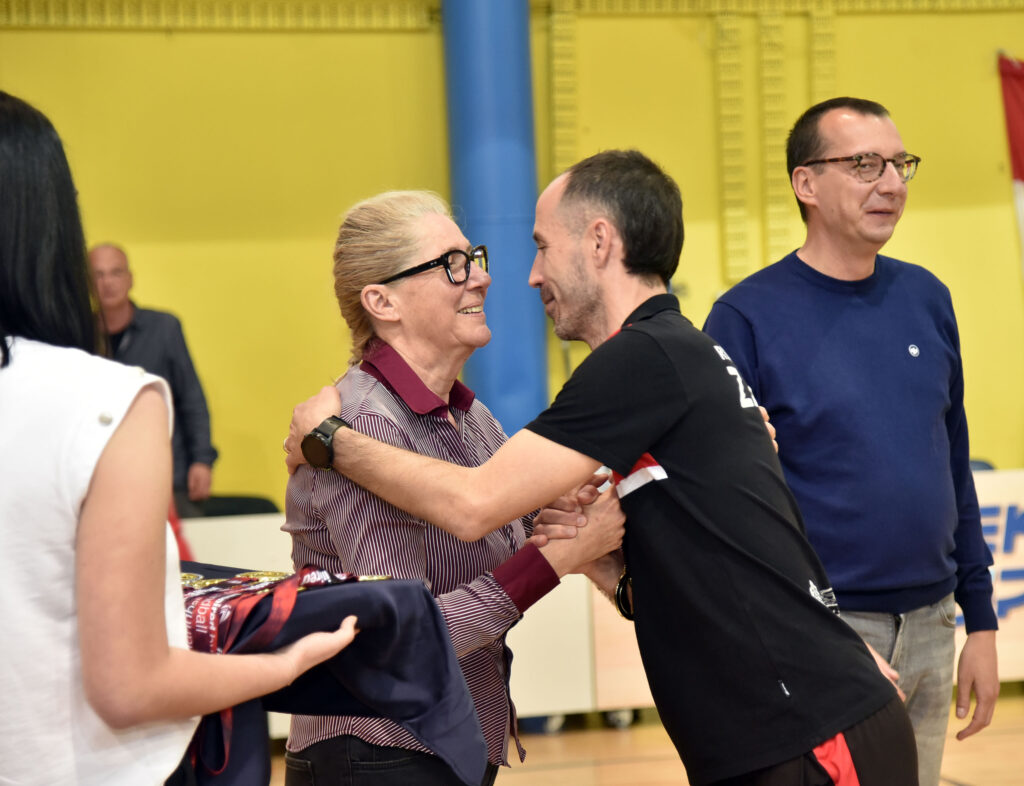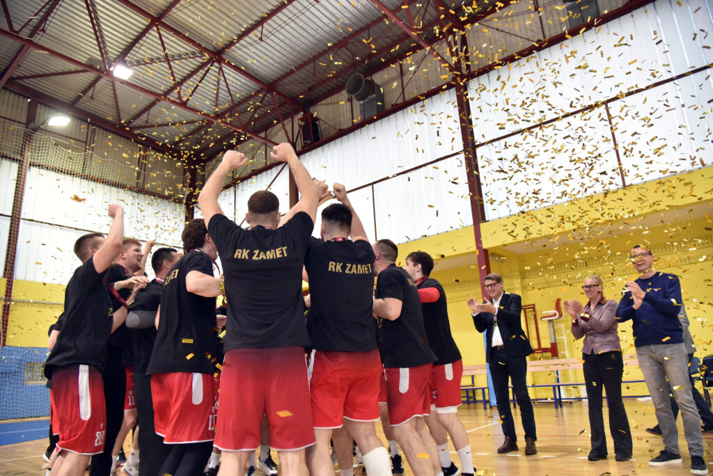 RIJEKA Niz ugodnih epizoda doživljen je na oproštaju rukometaša Zameta s natjecateljskom sezonom, u kojoj su nakon brodoloma i ispadanja iz elitnog društva ekspresno izborili povratak među najbolje. U tom spletu lijepih trenutaka najveće oduševljenje na dobro popunjenim tribinama u momčadi trenera Matea Hrvatina izazvao je trenutak kada je Boris Konjuh, član Upravnog odbora HRS- a i potpredsjednik Rukometnog saveza PGŽ-a, kapetanu Zamećana uručio pehar za prvaka Prve lige – jug.