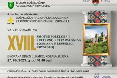 Bošnjačka nacionalna zajednica za Primorsko-goransku županiju i SABAH – Sabor bošnjačkih asocijacija Hrvatske, organiziraju XVIII. smotru folklora i kulturnog stvaralaštva Bošnjaka u Republici Hrvatskoj, koja će se održati u subotu, 27. rujna 2025. godine u dvorani Dinka Lukarića, […]
