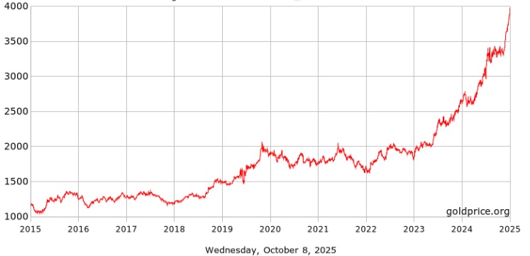 Zlatu je trebalo punih osam godina od 2015. do 2023. godine da „podupla” cijenu po unci (28,35 grama), s 1000 na dvije tisuće američkih dolara. Koliko je ekonomska svjetska situacija klimava i nepredvidiva u posljednje vrijeme, govori i činjenica da je za novo duplanje vrijednosti zlata trebalo samo dvije godine. Naime, danas je cijena unce prvi put u povijesti skočila iznad 4000 dolara.