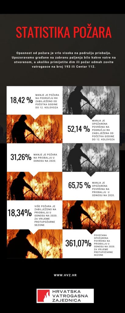 Prema podacima koje je prikupilo Vatrogasno operativno središte Hrvatske vatrogasne zajednice, od početka godine do 12. kolovoza na području RH zabilježeno je 3937 požara otvorenog prostora, što je za 18,42 % manje u odnosu na prošlu godinu, kada je zabilježeno 4826 požara. U istom razdoblju opožareno je 18834 ha, što je za 52,14 % manje u odnosu na 2020. godinu kada je opožareno 39356 ha.
